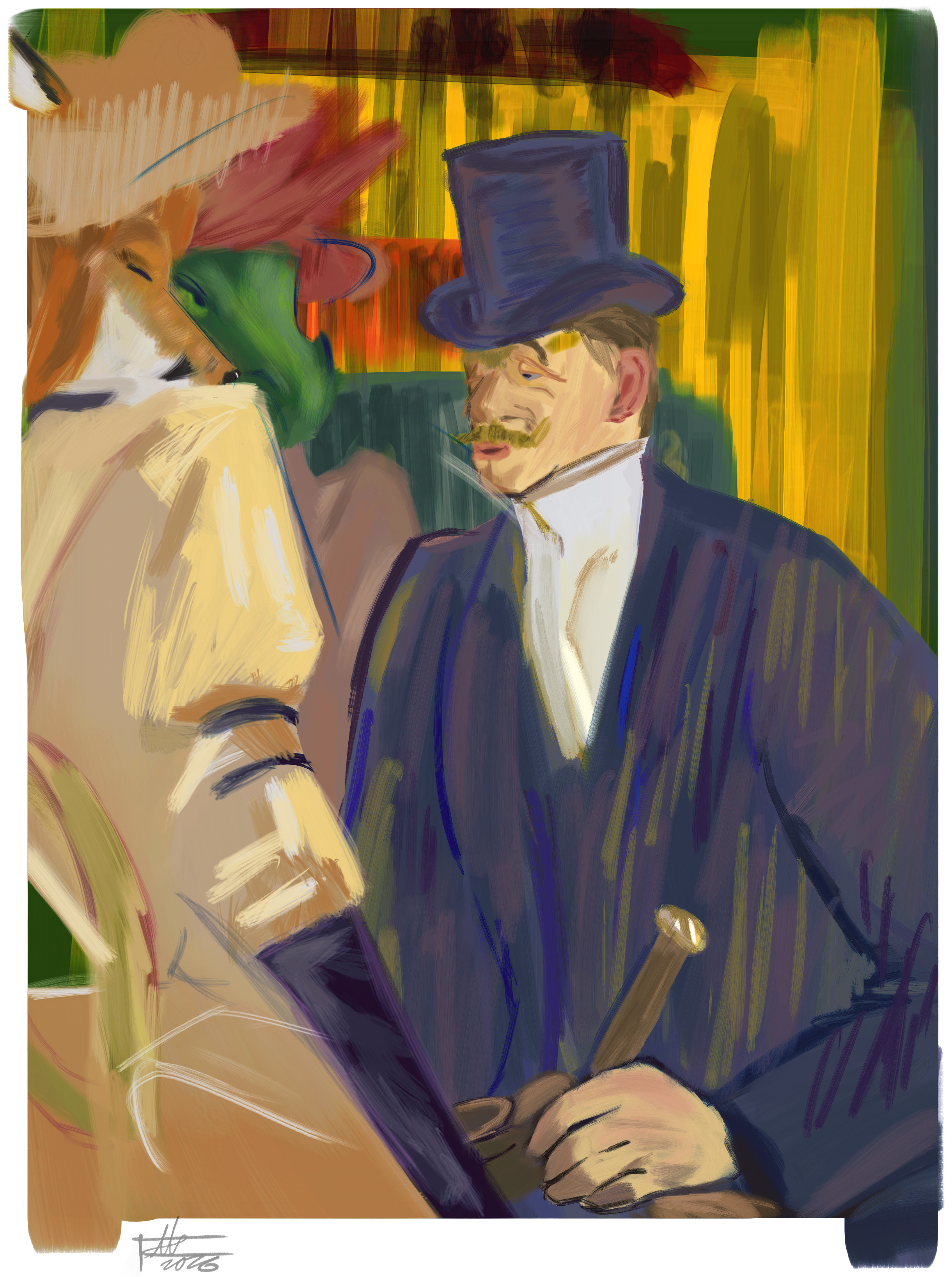 Did a study of 'The Englishman at the Moulin Rouge' by Henri de Toulouse-Lautrec, and liked the Painting so much I took the time to do a "waifurised" version, so to speak.