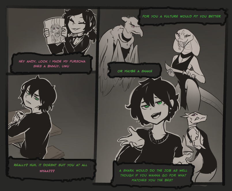 >>81306450>>81306521It's all fun and games until you realize Morgan is a self-insert of the artist and she behaves pretty much the same IRL, which starts putting a lot of the shit in her art into question.