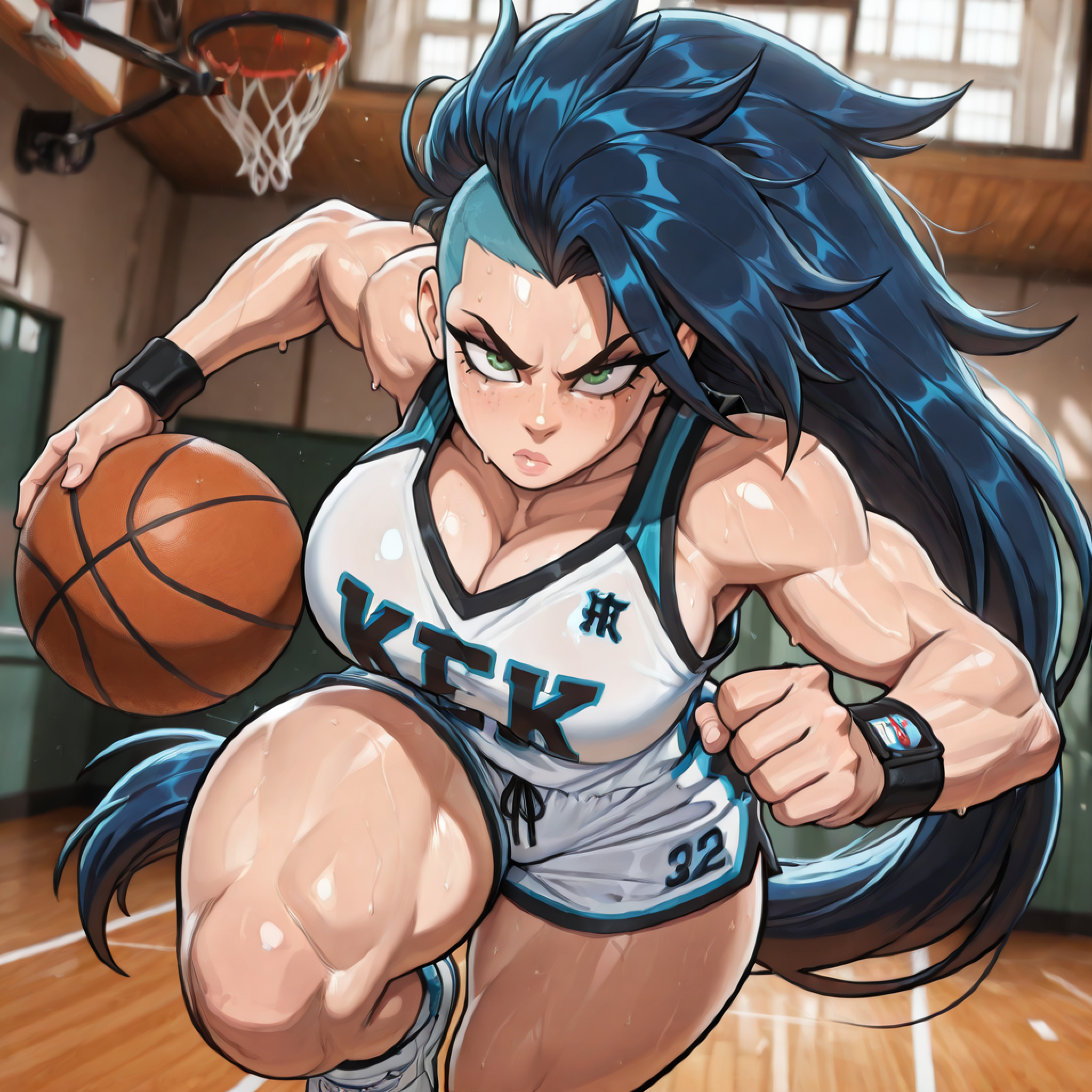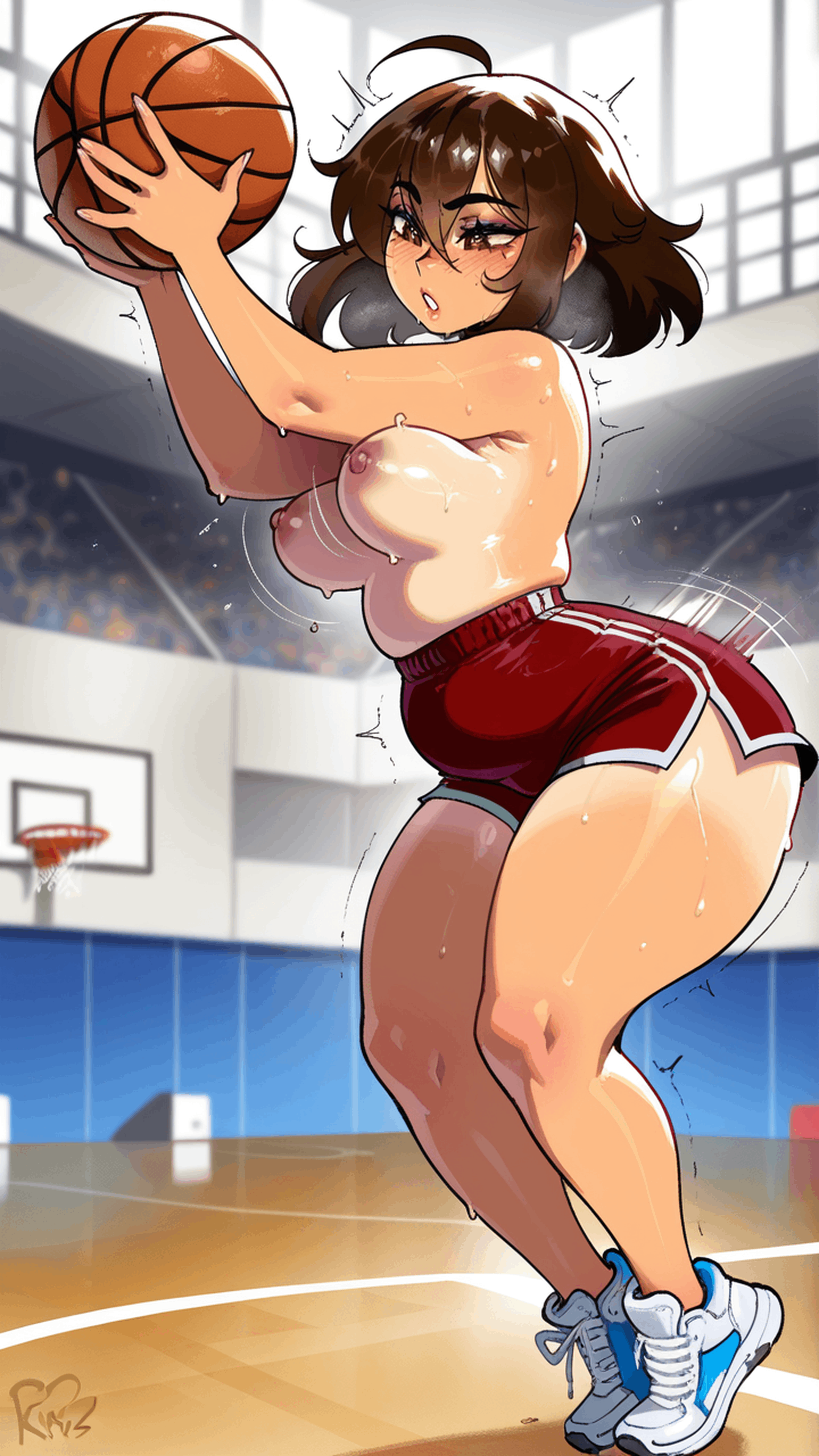 >>81305530Your waifu playing basketball in basketball shorts and topless