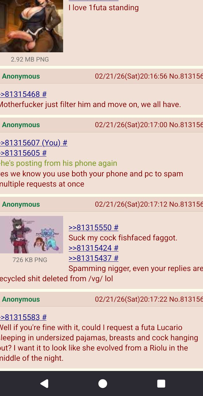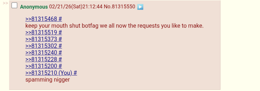 >>81315468keep your mouth shut botfag we all now the requests you like to make.>>81315519>>81315373>>81315302>>81315240>>81315228>>81315200>>81315210spamming nigger