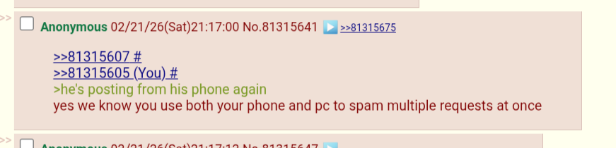>>81315607>>81315605>he's posting from his phone againyes we know you use both your phone and pc to spam multiple requests at once