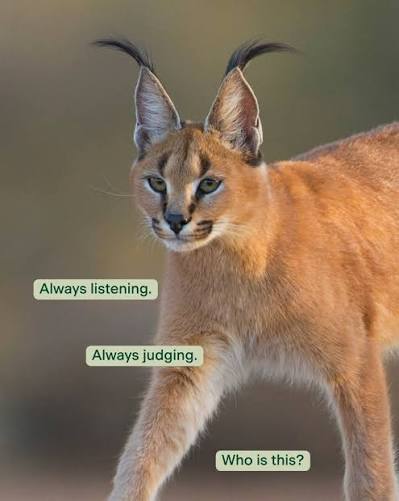 >>81390998This should go without saying for whatever you post. Images are a way to express yourself in a different light. Surely the caracal poster looks like that, or lives in a caracal neighborhood.