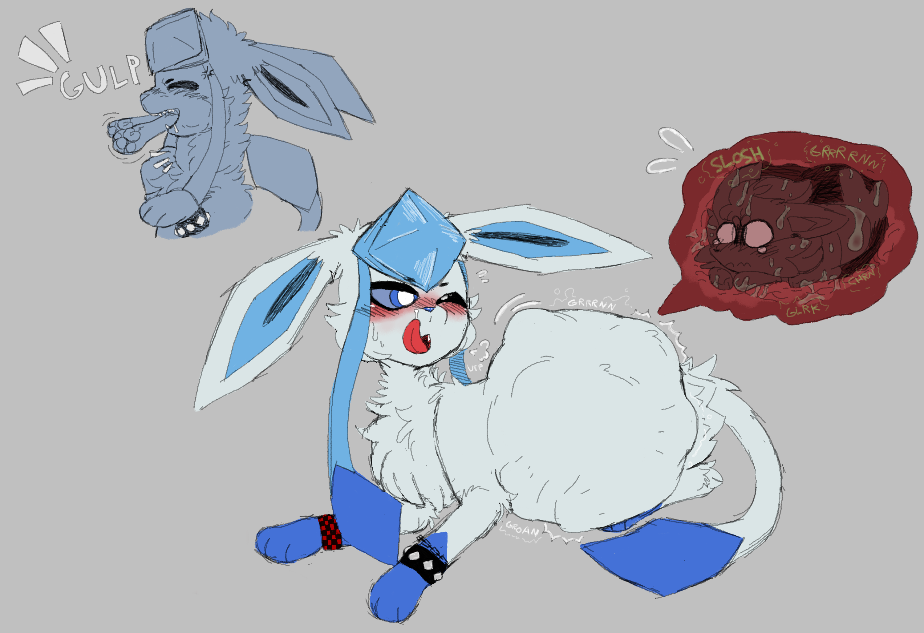 Getting gulped and drained of levels in the guts of a sylveon for hours on end, shlurking and slurping and suckling, a drain kiss slurping you so deep you come out the butt...