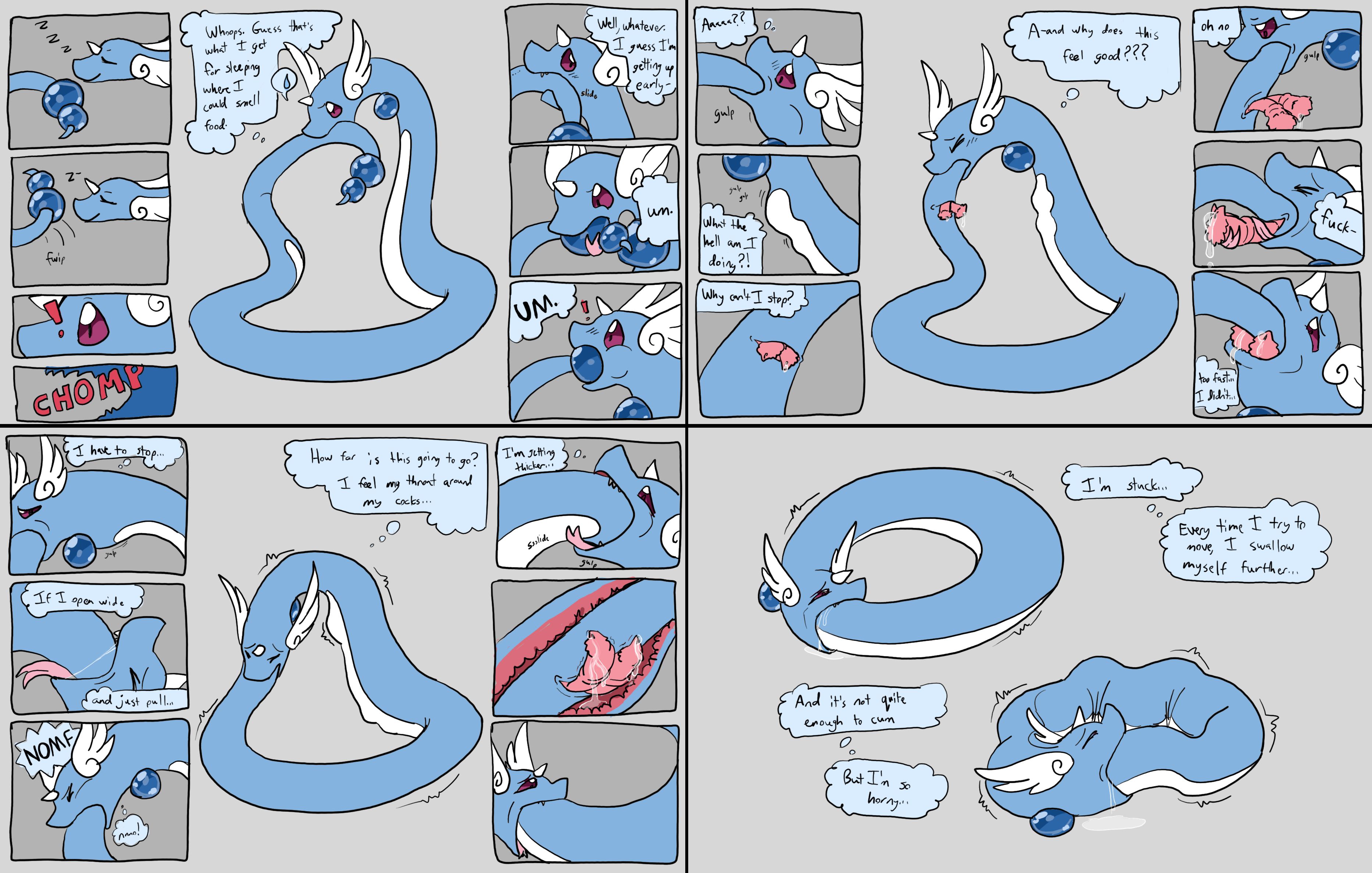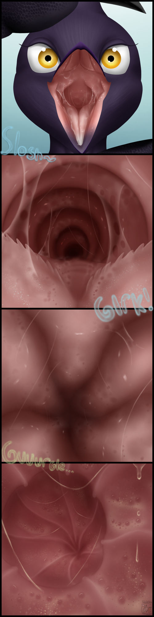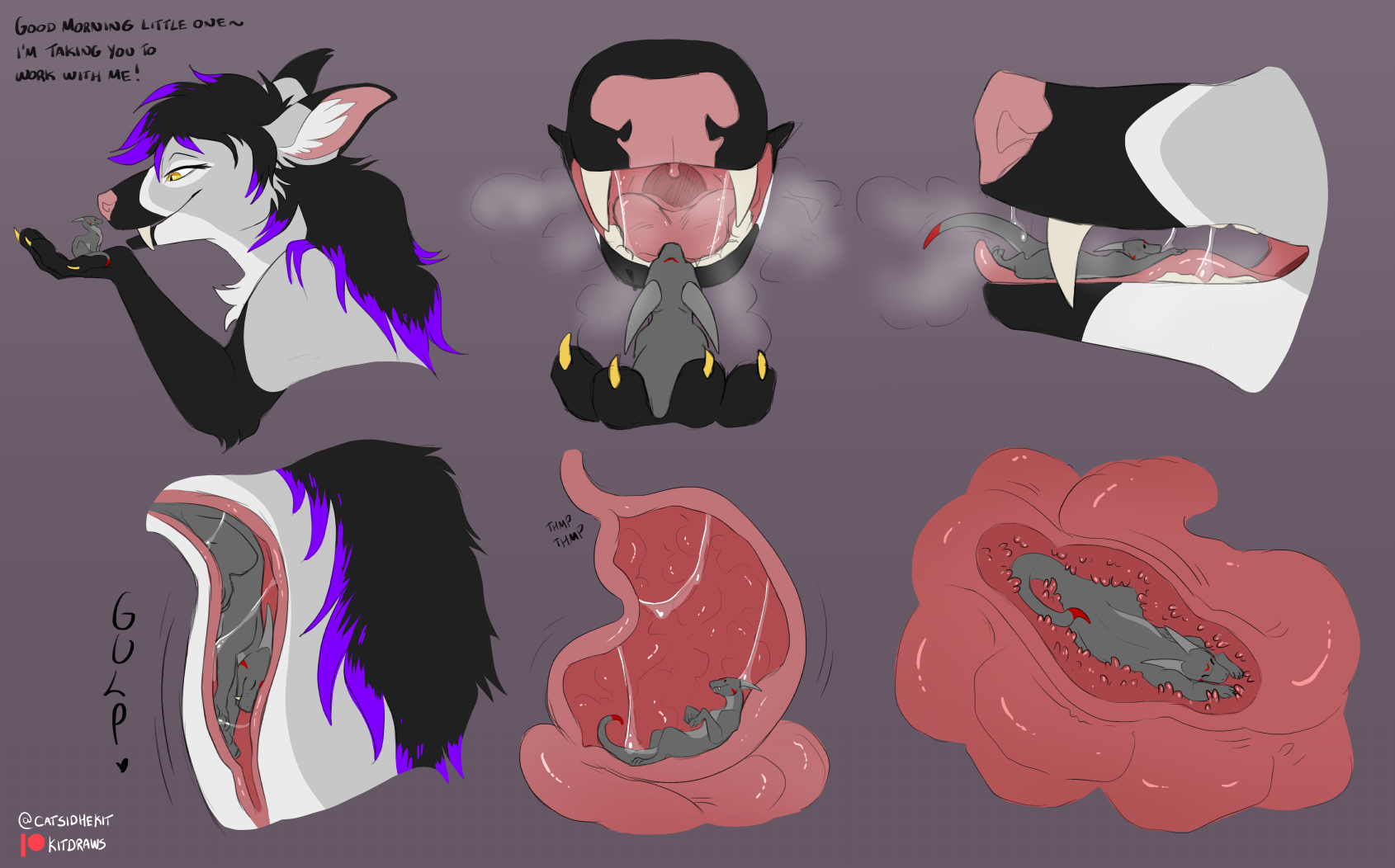 I don't know I just swear I saw itI'm sure I'll stumble on it again when browsing Just as I see the swallow guy complaining about people skipping to the stomach and me just thinking on how I see fulltour in that "it's like more swallowing" way. A lot of fulltour doesn't really do the going deeper inside depiction for some reason, somehow my drawings are one of the few that even depict the prey slipping into the duodenum. That's embarrassing, I shouldn't be even close to the forefront of any niche. Let alone one as obvious as fucking fulltour.