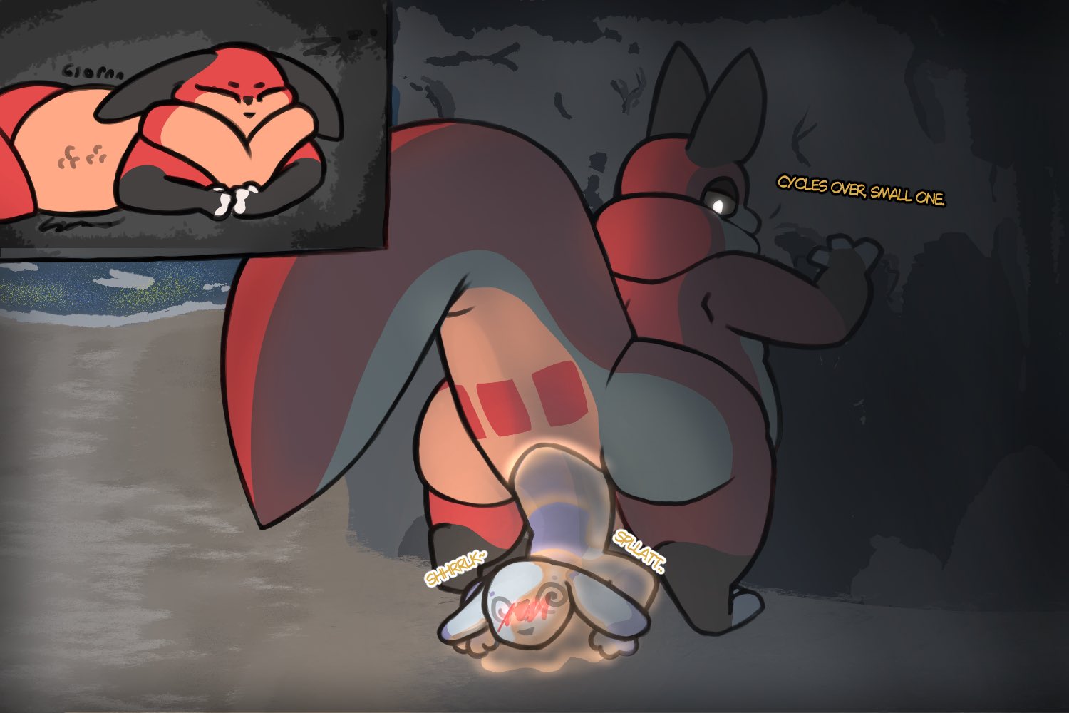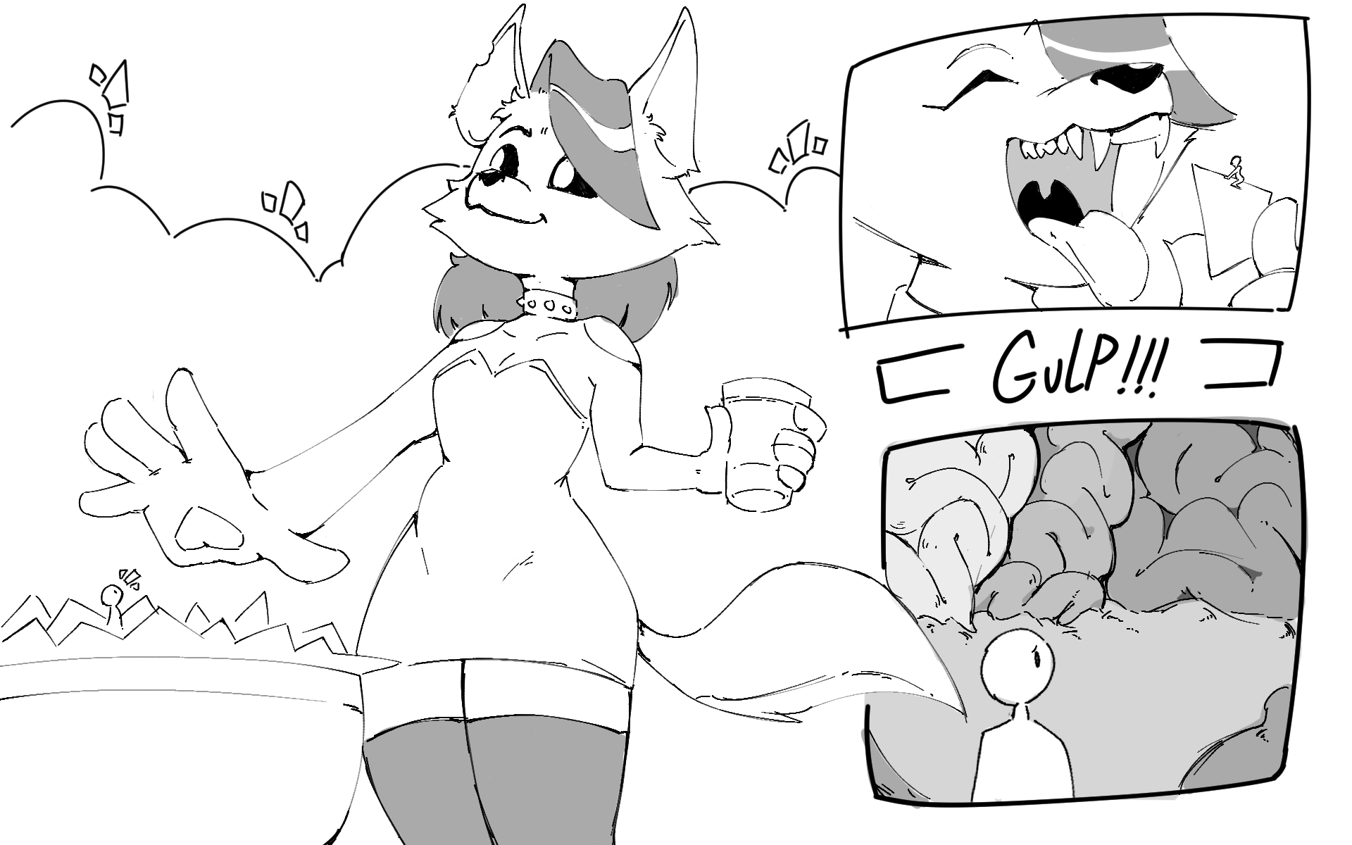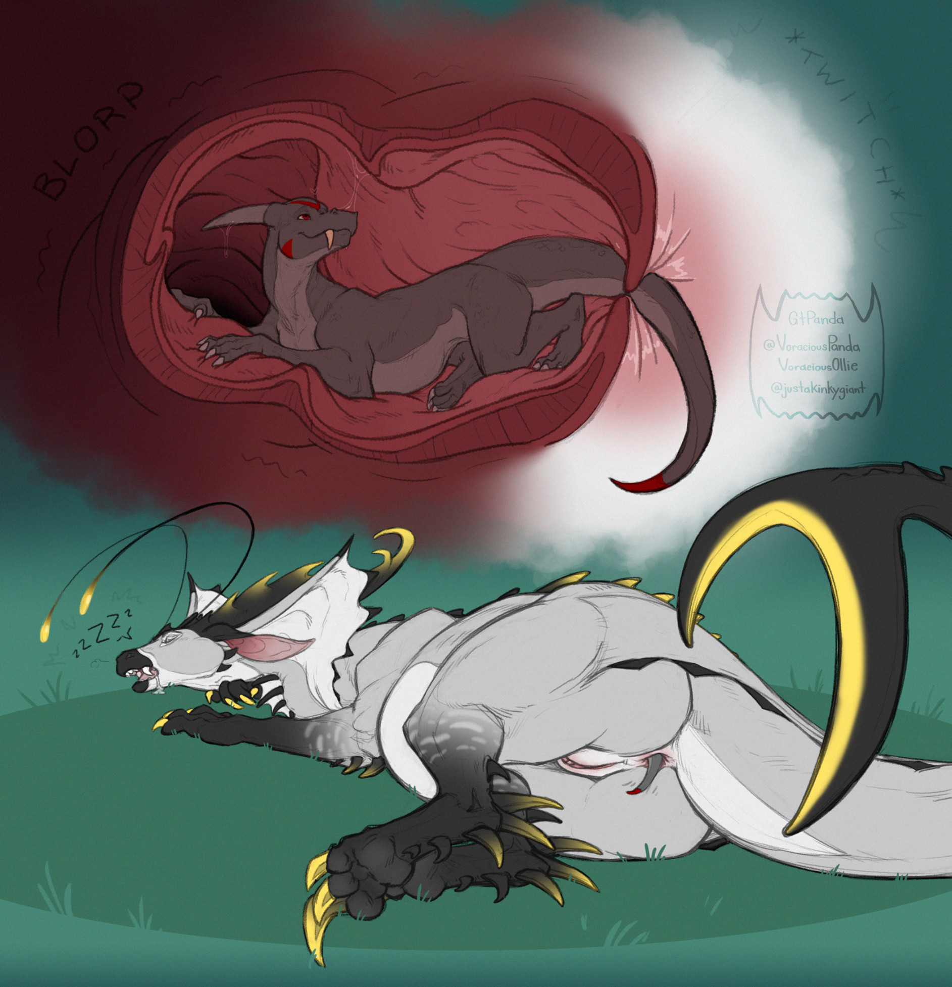 I don't know I just swear I saw itI'm sure I'll stumble on it again when browsing Just as I see the swallow guy complaining about people skipping to the stomach and me just thinking on how I see fulltour in that "it's like more swallowing" way. A lot of fulltour doesn't really do the going deeper inside depiction for some reason, somehow my drawings are one of the few that even depict the prey slipping into the duodenum. That's embarrassing, I shouldn't be even close to the forefront of any niche. Let alone one as obvious as fucking fulltour.