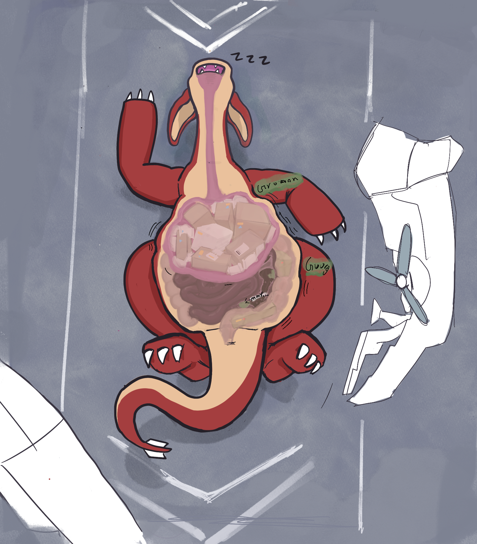 >>81478249I mean internals, he's always in the stomach. a cutaway version of >>81478133 with him past the stomach would be diamonds
