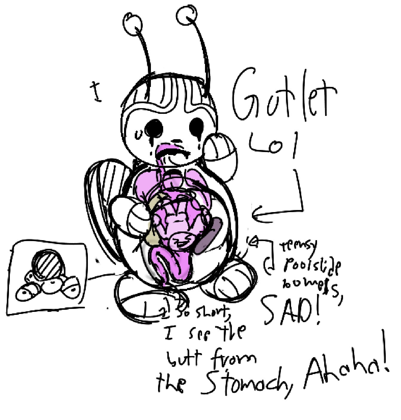 I think the intestines were made to have tiny people in themthey're so squeezy and cuddly on people in themsuckling around them absorbing any cum they produceslowly working them through those bends why would they keep people away from the intestines?why would they do that?