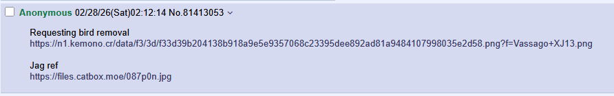 Requesting bird removalhttps://n1.kemono.cr/data/f3/3d/f33d39b204138b918a9e5e9357068c23395dee892ad81a9484107998035e2d58.png?f=Vassago+XJ13.pngJag refhttps://files.catbox.moe/087p0n.jpg