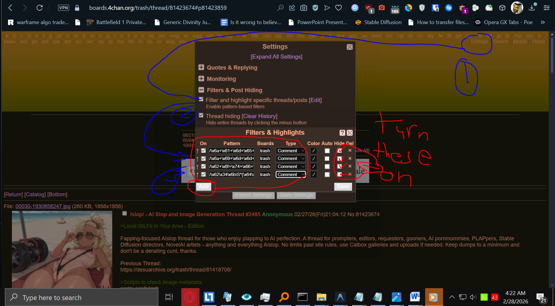>>81423674filters to help ur slopping experience.reminder to also filter image md5 manually for new images I didn’t write in the md5 filter section. I well try to update the filters and md5 ids in the futurego to settings here and make sure stubs are hidden like this picrel.go to filters and put this in image md5./HNJeSqln6jdTktkYKcHbpQ==//ooisan+yW/1cZCV7UGYs3A==//lE+0EkS2cxcoMi+FVcgTVg==//bbpGh5UabpIlPdovOz8QDA==//SnIXhfwkY7jSi5mKsP28cA==/and in filters general put this./\x6a+\x61+\x6d+\x65+\x73+/i;boards:trash;op:no;hide;replies/\x6a+\x69+\x6d+\x6d+\x79+/i;boards:trash;op:no;hide;replies/\x62+\x6f+\x74+\x66+\x61+\x67+.?,?'?s?/i;boards:trash;op:no;hide;replies/\x64\x65\x73\x75\x61\x72\x63\x68\x69\x76\x65\S*(\x64\x65\x6c\x65\x74\x65\x64\S*\x66\x69\x6c\x74\x65\x72|\x66\x69\x6c\x74\x65\x72\S*\x64\x65\x6c\x65\x74\x65\x64)/i;hide/\x62\x34\x6b\S*(\x64\x65\x6c\x65\x74\x65\x64\S*\x66\x69\x6c\x74\x65\x72|\x66\x69\x6c\x74\x65\x72\S*\x64\x65\x6c\x65\x74\x65\x64)/i;hideadded a new filter