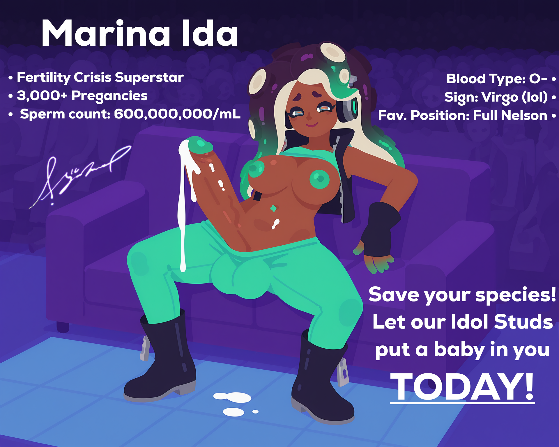 >>81425845>"The Idol Fertility Program was a huge success. Within less than five years, Cephalopod populations had returned to their pre-war levels, and beyond.">"The most successful Idol Stud, Marina Ida, sired a total of ten thousand and two children, with the final thirty-two being conceived on stage and live on air during the program's farewell concert.">"The concert was meant to end each of the Idol Studs' 'final scores' at a round number, but of course fate intervened. The final mother of the night conceived triplets, and by the time this organizers learned of this fact, Miss Ida had already retired to a secluded island mansion with her favorite partners and a lifetime supply of Pedialyte."