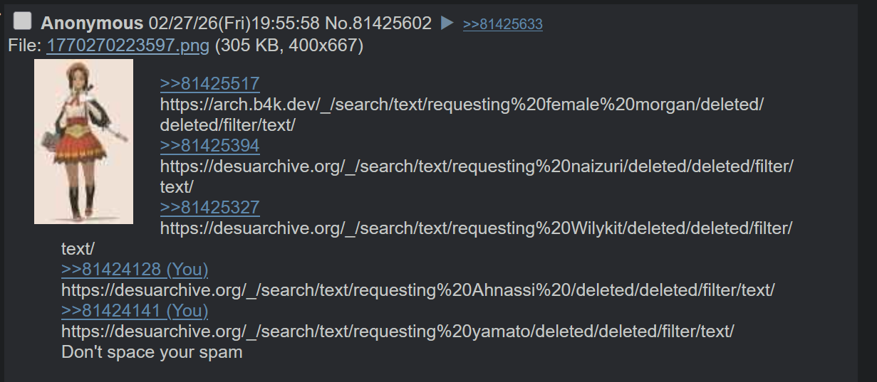 >>81425517https://arch.b4k.dev/_/search/text/requesting%20female%20morgan/deleted/deleted/filter/text/>>81425394https://desuarchive.org/_/search/text/requesting%20naizuri/deleted/deleted/filter/text/>>81425327https://desuarchive.org/_/search/text/requesting%20Wilykit/deleted/deleted/filter/text/>>81424128 https://desuarchive.org/_/search/text/requesting%20Ahnassi%20/deleted/deleted/filter/text/>>81424141 https://desuarchive.org/_/search/text/requesting%20yamato/deleted/deleted/filter/text/Don't space your spam
