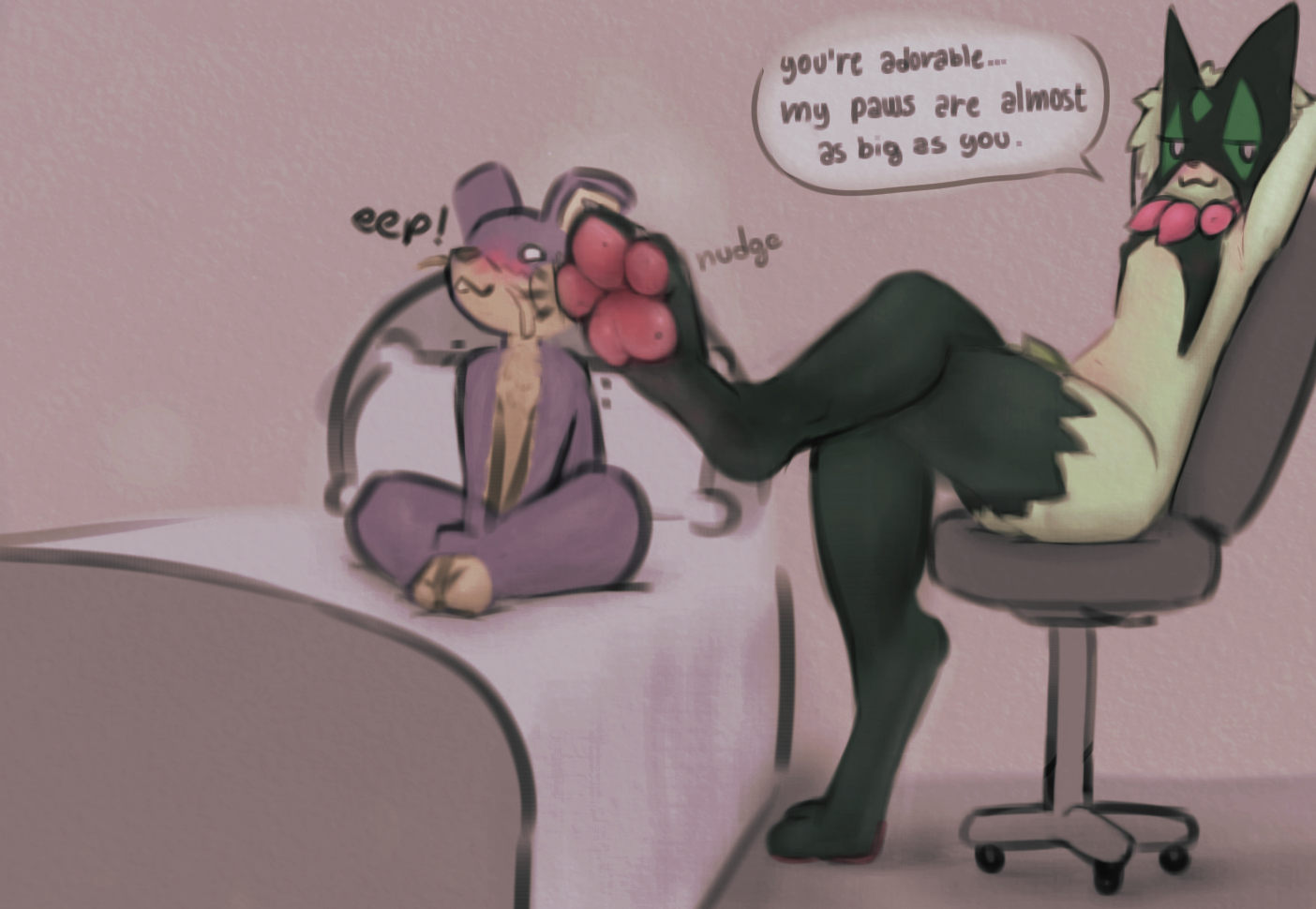 >>81550891Yooo welcome back, loved the Pulchra drawing you did last time.Dunno if you're OK with other peoples OCs, but I'd love something of Apogee reluctantly presenting her paws after taking of her sneakers.