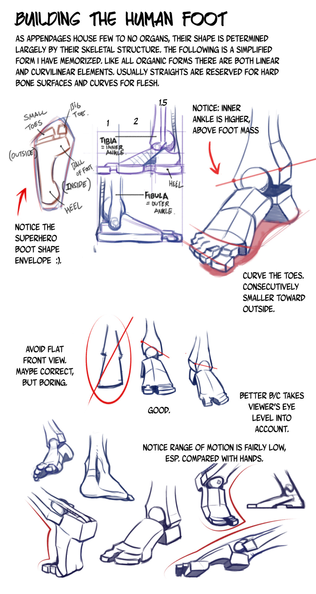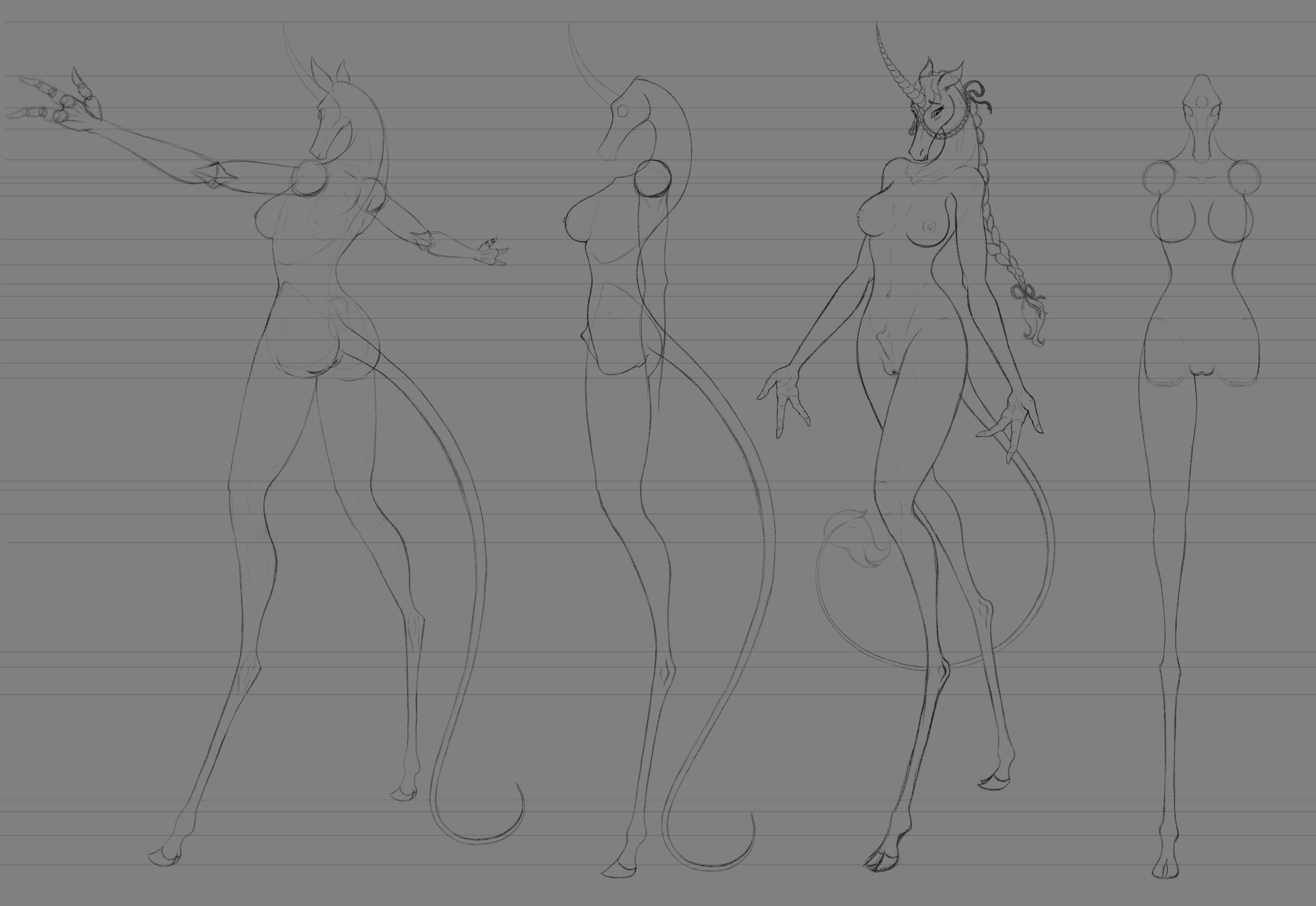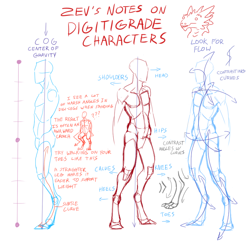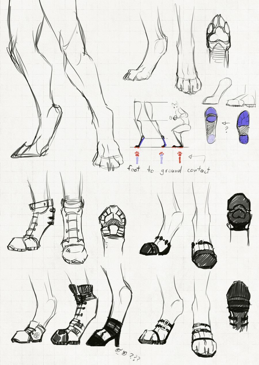 >>81490801Hmm, B's not quite how I meant it, I think. I was thinking more along the lines of pic related (some of my own experimentation for an abortive attempt at creating a bit of a guide on the subject of various ways to do anthro legs, maybe I should revive that project) with all three segments (thigh, shin and foot) being of roughly equal length. B would probably work fairly well if scaled down to be the same length as A, it'd be about equivalent to leg #2 in pic related, which is the same as the human leg beside it but with a slightly elongated foot in digitigrade configuration. The #1 unguligrade leg is the same way, except with an even more elongated foot, plus the hoof as even more extra length. The last two legs are what happens if you shrink equal length segment legs (both digitigrade and unguligrade) down to a scale where the character would be more comparable in height to a human when you add a torso and head.A's shin is still significantly shorter than the thigh, but the proportions do look better to my eyes. If the configuration speaks to you, it wouldn't be a bad compromise, since you could fudge it for poses that benefit form a bit of proportional cheating without it looking too obvious. The trad drawing in the upper right corner of pic related is an illustration of the primary problem with a shorter shin design as compared to the equal segments design, especially if the foot isn't also shortened; it doesn't play well with anything that requires you to bend the knee back a lot, such as most kneeling and many sitting poses.