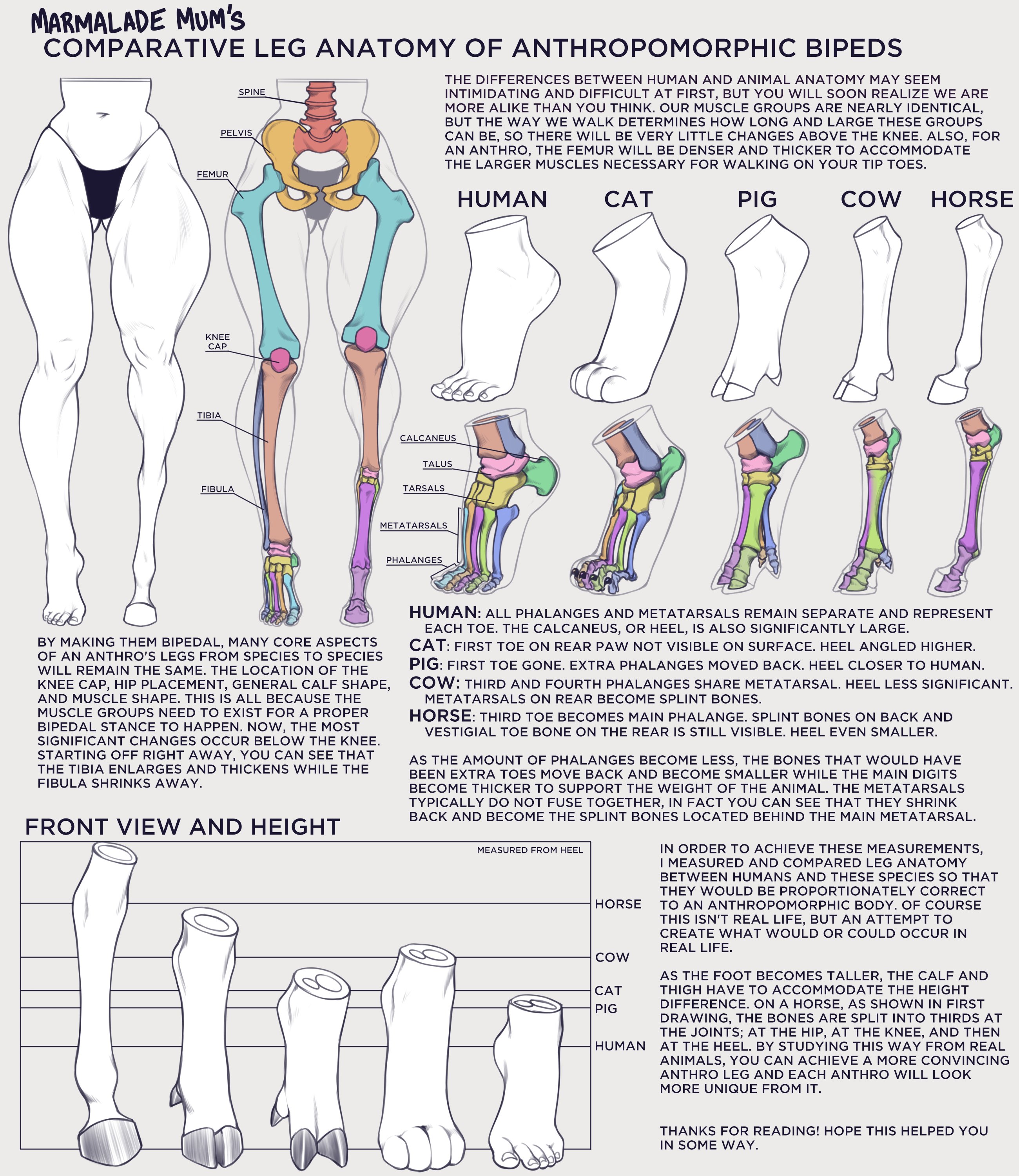 >>81489534Digitigrade legs will indeed make anthros taller, if they otherwise maintain humanlike proportions, provided the new legs are proportioned like human legs, seeing as it's effectively the same as wearing very high heels on very long feet at all times. One option to prevent a noticeable increase in height is to reduce the length of some segments of the legs, as you've done here with the shin and foot. The problem with this approach is that it tends to leave things looking lopsided on a bipedal figure. If you look at IRL mammals, you'll find that their rear leg bone segments are usually relatively similar in length; if one is significantly shorter, it's almost always the foot. So, a safer approach is to only reduce length in one section, and the safest section to reduce is the foot. A lot of anthro artists instead choose to reduce the shins, and it works nicely for standing poses, but as I pointed out in the last thread, is also causes posing issues with many non-standing poses and you'll have to fudge the proportions for those particular cases or get ready for some tricky guesswork and anatomical wrangling.Of course, if you keep all the segments the same length and just reduce the overall length of the legs to compensate, you'll end up with a slightly different lopsided look, arguably an even worse one; see pic related's profile view of the figure. This has been the crux of the issue for me personally, since I really like how that particular leg configuration looks, and my ultimate solution was to simply go balls to the wall with the legginess by adding to the standard length human leg one additional half of length (or slightly longer, even, if you consider that a hoof is essentially a really long toe and can be read as a somewhat separate entity from the foot segment in that capacity).