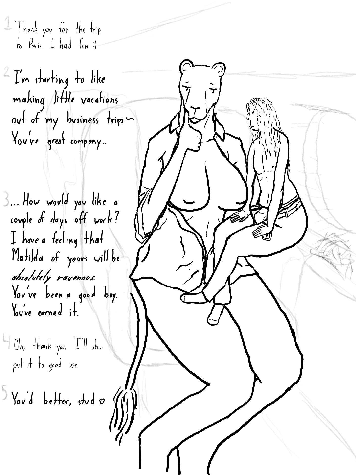 >>81489534That particular solution might not work quite as well for you, however, since it would appear you like your anthro ladies to have a fair bit of meat on their bones, so this approach would make their already tall frames even taller or, if you reduce their overall scale to compensate for the extra height, you'd also make them have less sheer presence as a result. My approach works best for lithe figures (should probably do some experiments on how it'd work on a heavily muscled frame again, been years since my last batch of that), so even if isn't immediately useful, you'll want to keep it in mind in case you ever start feeling like your character roster could use one of those for the sake of variety. Design problems like these are a careful balancing act between factors and hard, fast rules and clear answers are hard to come by. Use your judgment and personal tastes to arrive at a conclusion that pleases your eyes.However, I’ll say here that Mrs. Blackwell’s legs don't look too lopsided to me in the museum scene piece. Could be the pants masking it again, though, hard to say for certain. Experiment with various solutions and see what looks best to you.