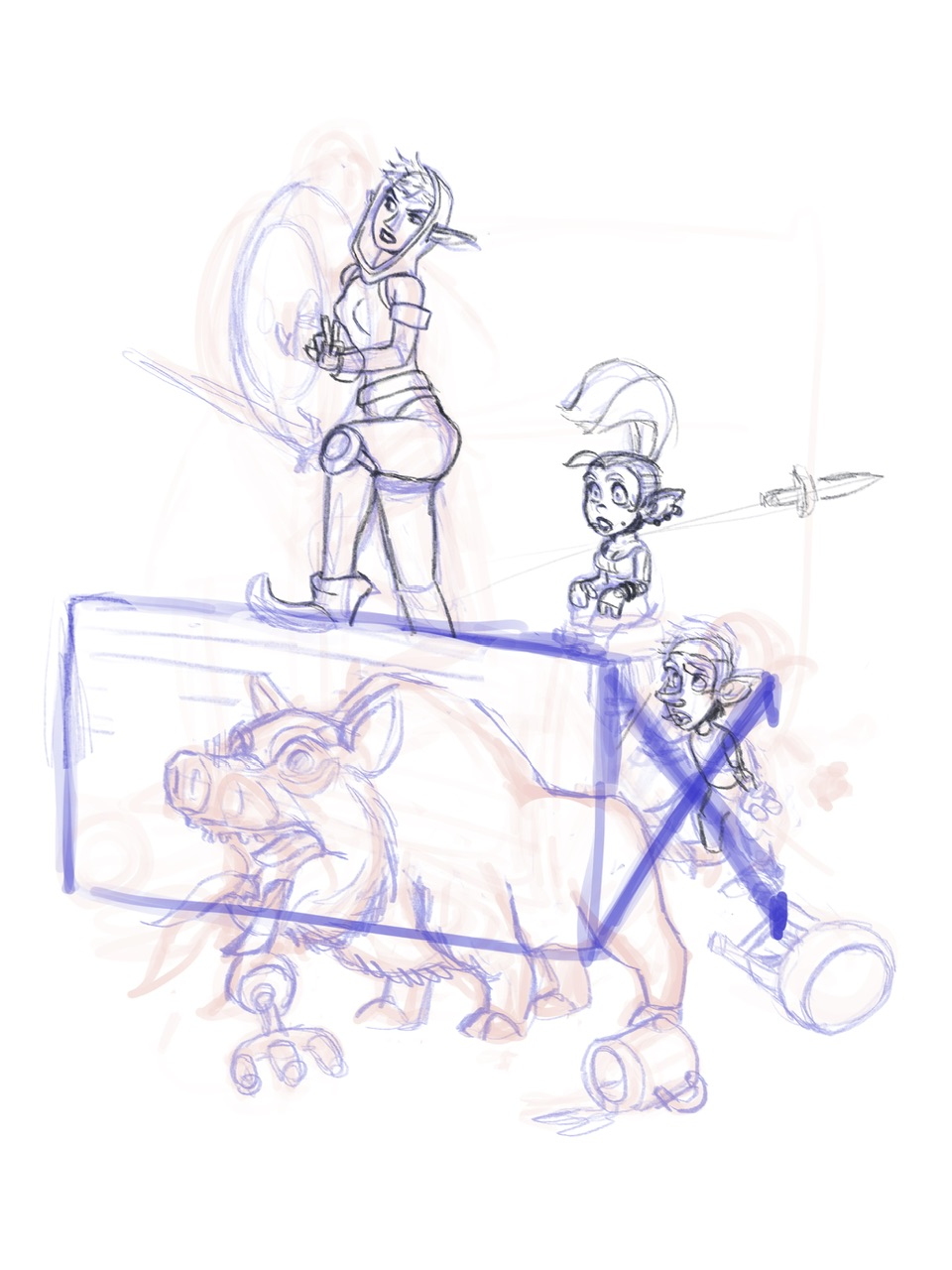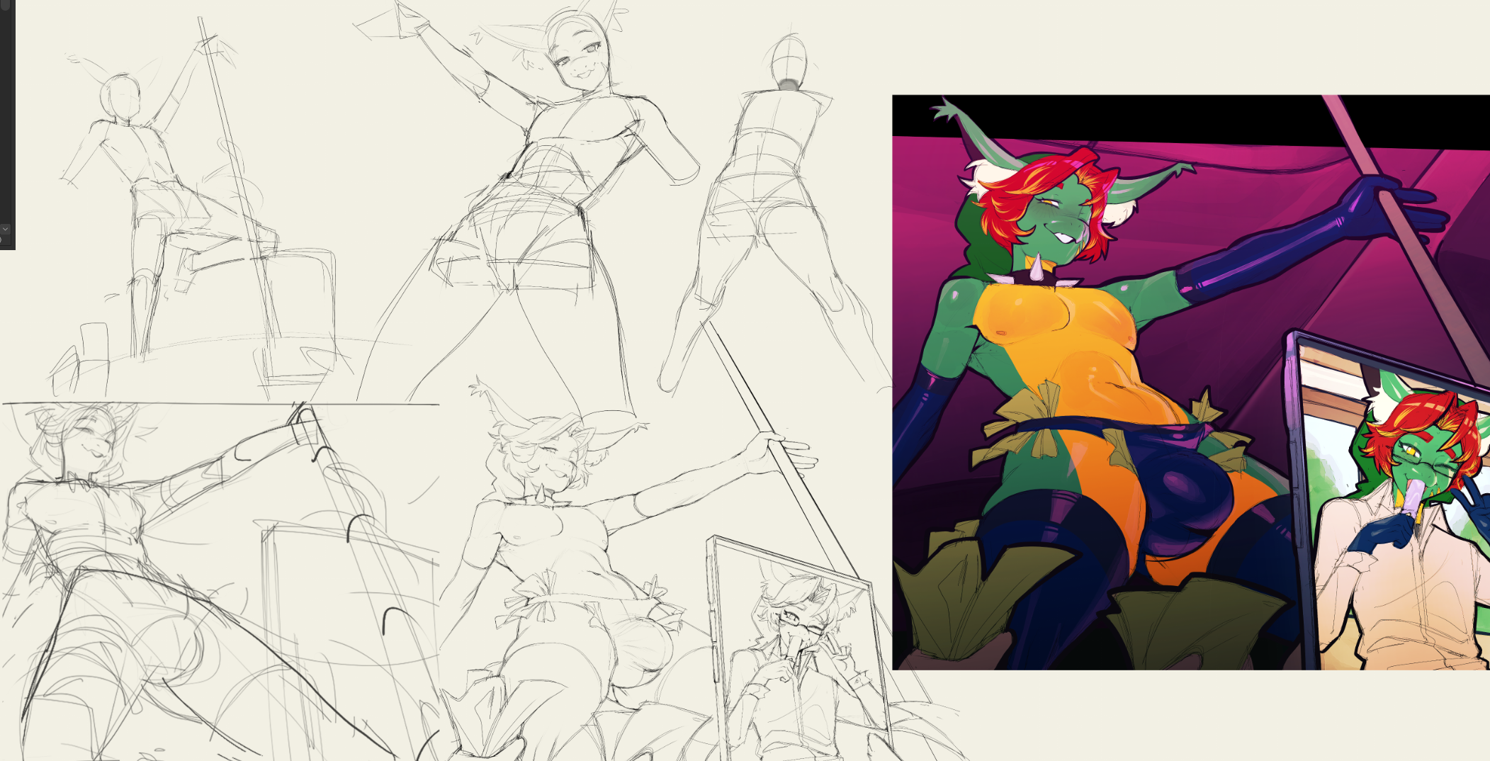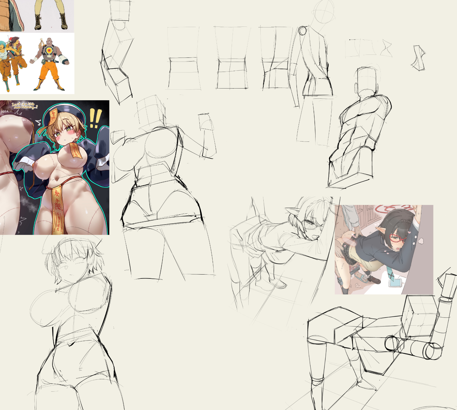 >>81535652So extending off of >>81535387 I can honestly say that my lack of reference use it do to laziness? I often don't want to spend 2 hours searching for an image that perfect matches the nebulous desires and or the listed written desires of the commissioner. So I tend to just start with boxes and expand from there. The first 3 top sketches were pretty much shooting in the dark (And having all of them) the bottom left sketch was make getting really loose with it and liking the outcome while the bottom right is just refining it.>>81535433My personal drawing area is so small it pretty much just requires drawing from the elbow at max