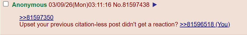 >>81597350Upset your previous citation-less post didn't get a reaction? >>81596518