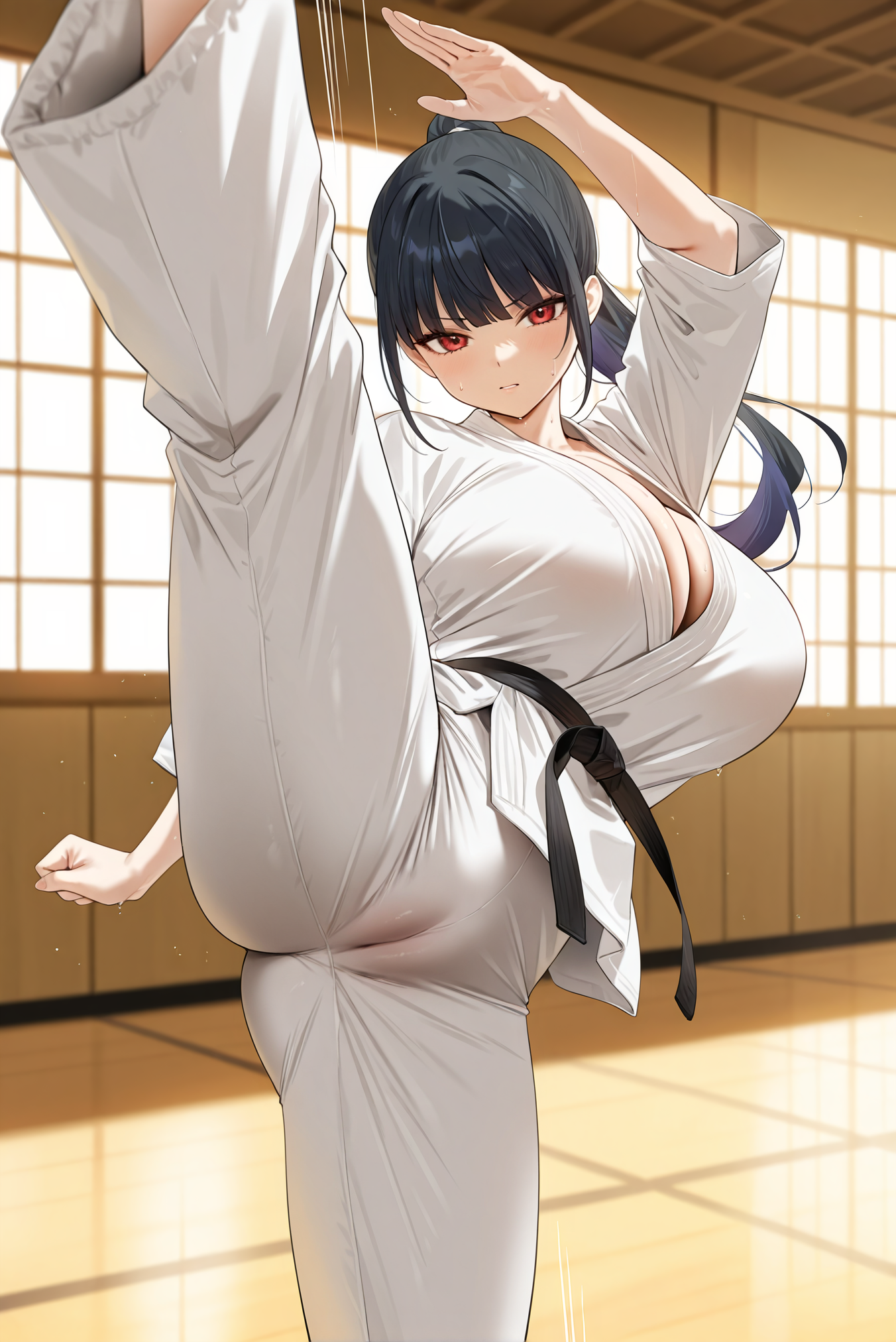 >>81651193Hot karateka! Now gen her with an open shirt, letting in some air flow on her sweaty cleavage and tummy.