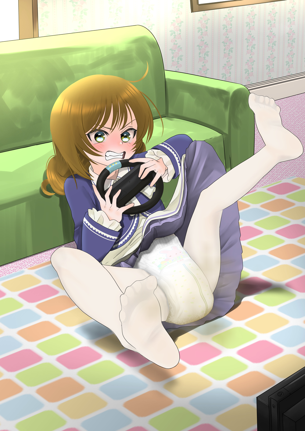 >>81802391Hmm. Now I wonder how it could work.Maybe for that to work IRL, the onesie needs to be made from a fabric that doesn't stretch much, and the buttons need to be easier to undo? Also the wearer might need a harder stool, because soft messes would just squish against the diaper?