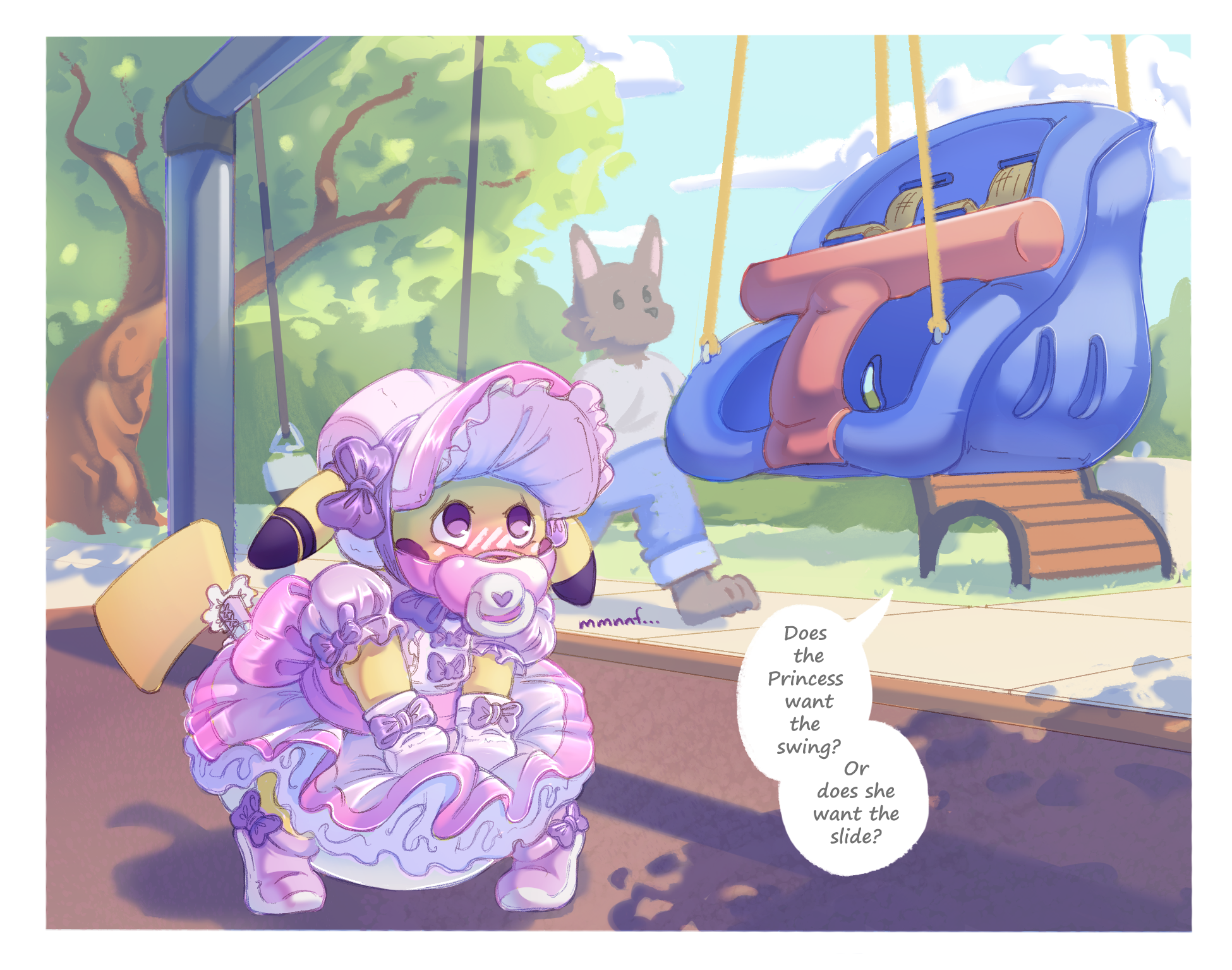 >>81939733According to the artist this pic is about a Pokemon friend evolving before the other does. Since Riolu need friendship to evolve I imagine that the still-Riolu did not experience enough love and would appreciate being babied. Hopefully the diaper is stretchy in case they suddenly evolve>>81939882>>81940235Rebel against the mom/friend's mom by pooping in them
