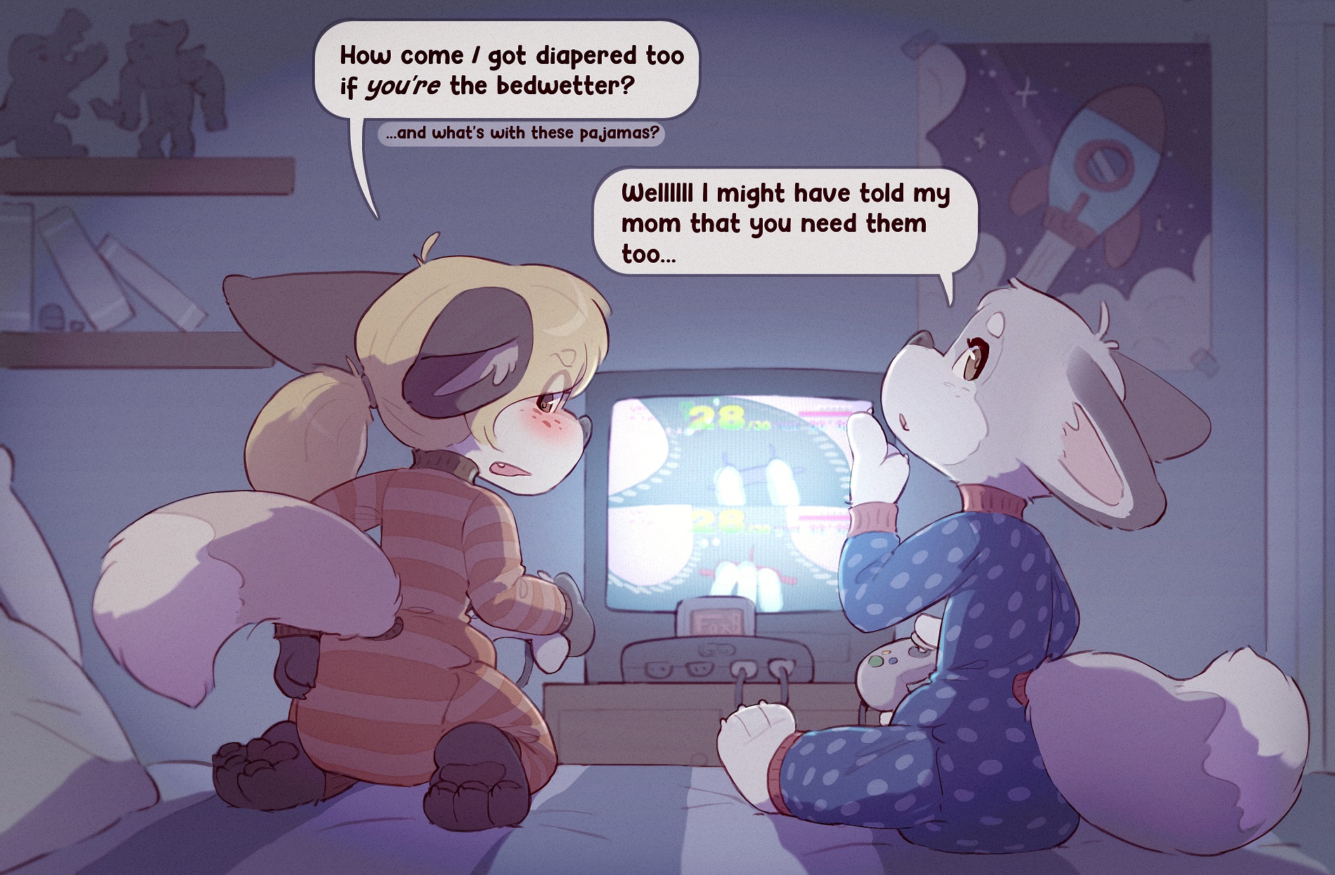 >you're at your friends house for a sleep over>its after dinner, the two of you are getting ready for bed>your friend's mommy takes you aside while your friend gets your sleeping arrangements prepared>she hands you one of his diapers and tells you to go get changed>you're confused and try to argue with her>she sighs, hushes you, and then grabs your hand, pulling you to your friend's changing table to get you changed>she lectures you on how its okay to have accidents and that there's nothing to be ashamed of>once you're diapered, she lets you off the table>you feel the bulk between your legs as you try waddling in your friend's oversized diapers>she pats your butt and whispers in your ear that you're expected to stay in diapers all night while you're over from now on>you try to talk back again and she gets firm, swatting your butt, threatening a spanking if she sees you disobeying>she gives you a hug and then ushers you off to bed>you confront your friend about it>turns out he lied to his mommy about you needing diapers too>now his mommy thinks you're a little bed wetter just like he is>annoyed, you just decide to go to sleep>late in the night, your friend gets out of bed and waddles down to the kitchen>he gets a big bowl and fills it full of warm water before sneaking back to his room>carefully, he puts the bowl near you and puts your hand in it>it only takes 15 minutes before you unknowingly soak your diaper>now his mommy will KNOW you're just a little bed wetter like he is