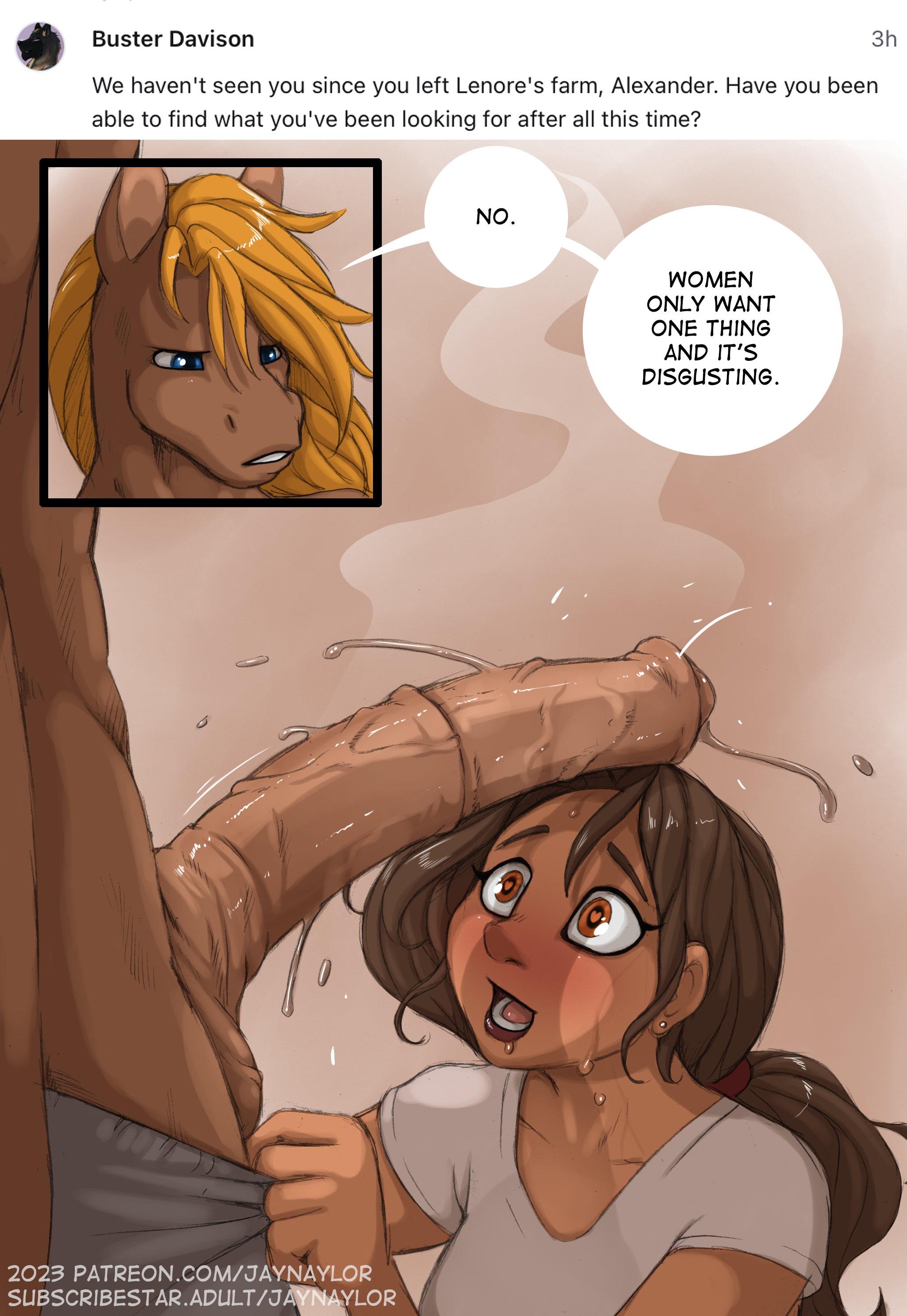>>81884512He already did? He made a whole comic trilogy, and extra, involving wolves cucking the king and setting up cults powered by their musk. Then made detailed lore dumps on the intricacies of how anthos and human mating works. Understandable if he got burnt out from doing it, or more likely, it wasn't as popular as his other more vanilla works so he completed it out of obligation and moved on. It's time for someone else to pick up the mantle.