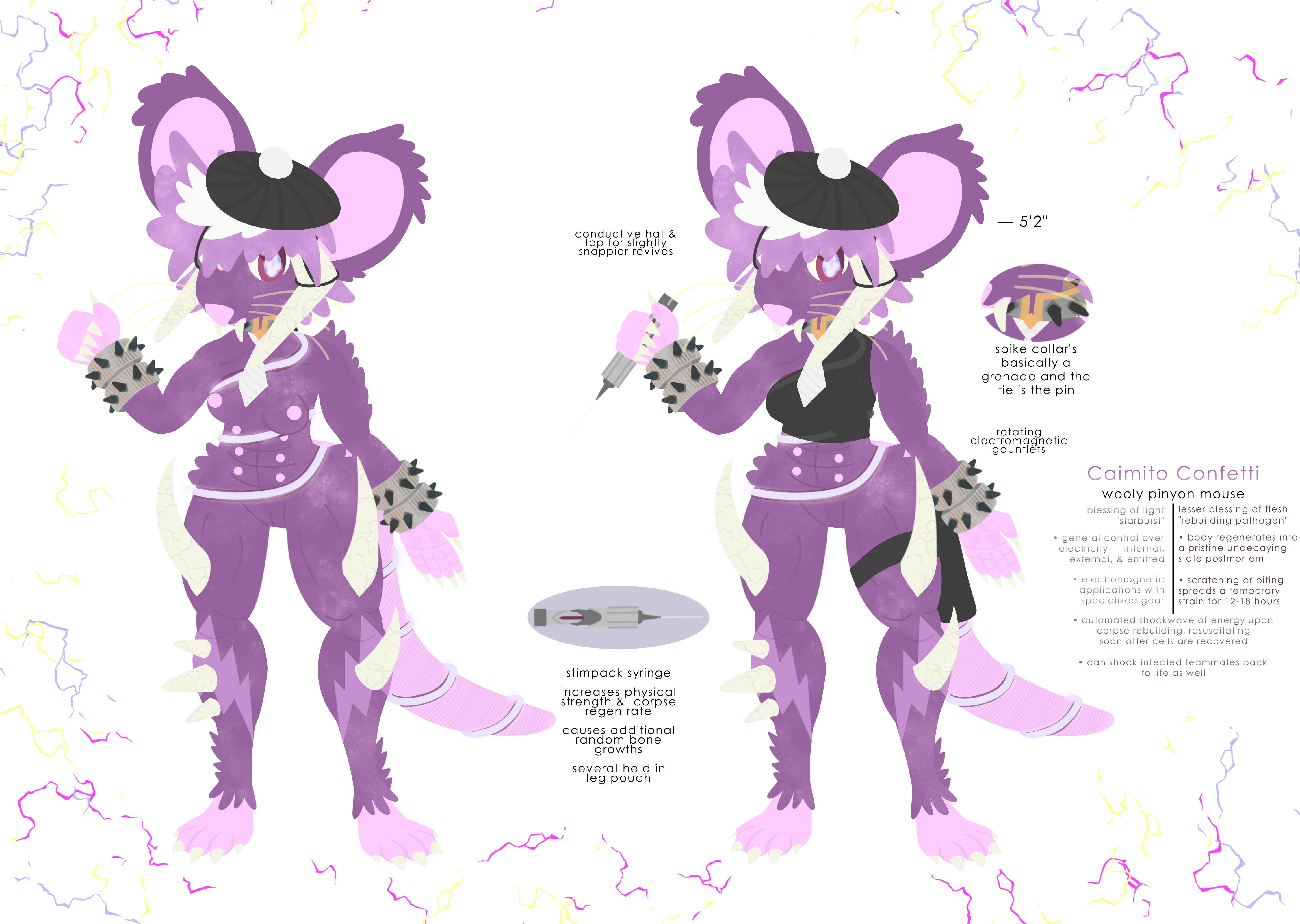 >>81868289Requesting my regenerating electro mouse utilizing her powers. Either;>Actiony pose, with her shooting a lightning bolt from her hand.>Lightning chaining between her horns and firing it off forward in a beam.>Her poking at her electromagnetic gauntlets, trying to get them to work, only for an anvil or car to rapidly fly toward her from offscreen.>Her levitating and overcharging some kind of giant railgun.>Her electromagnetically propelling an array of syringes, or tossing one at the viewer like Eminem, saying "WOE, 「UNDYING DEATH」 BE UPON YE".Should note that she sparks intermittently during power usage.>Does your OC have a home?Yes.>Where do they live?Undisclosed to prevent potentially remaining artifact-addled idiots from trying and failing to kill her for good. The longer she goes without dying the more stable she is, and there's no reason to subject herself or the world to her former self.>Who do they live with?Langsat. Big zombie elk, primary carrier of the Rebuilding Pathogen. Her only real remaining friend, both due to his longevity and her own volatility.>Do they own it?Technically he does, under a pseudonym, but she's de-facto owner. It's needful that she isn't /officially/ at any location.>What would their dream home be?Exactly what she has now. Ye-olde French farmhouse with several subterranean floors of laboratory.