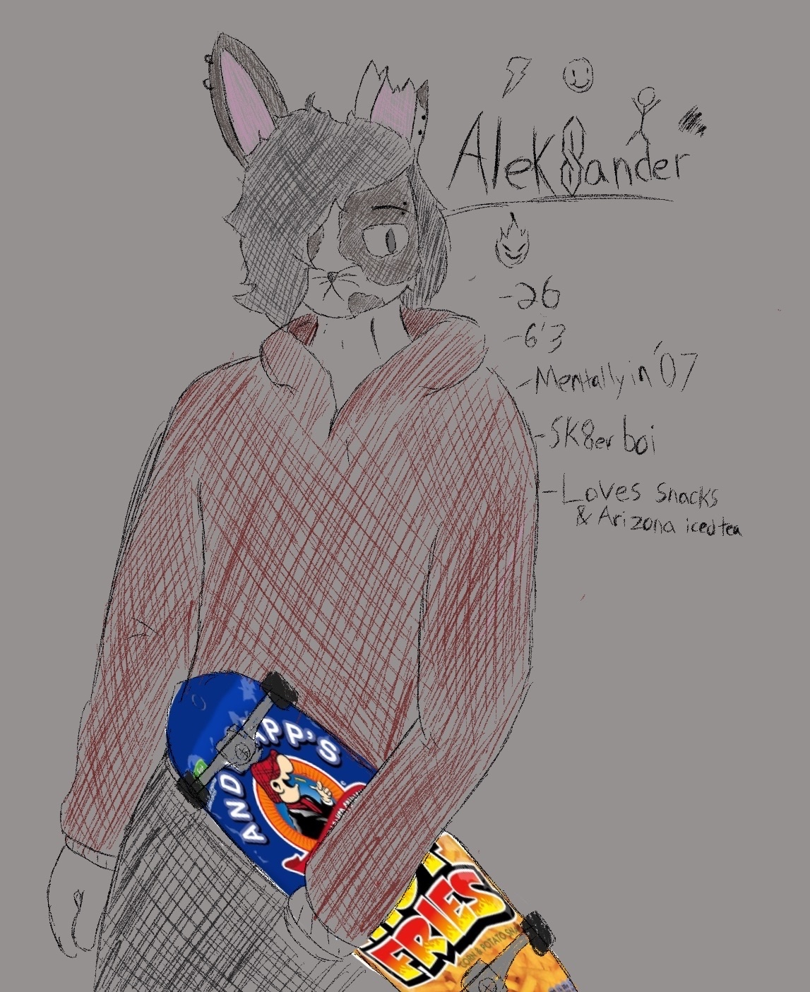 >>81868289Requesting Aleksander smoking a french fry like a cigarette>>81868285>How did you come up with your OCI had a bunch of furries as friends, so they wanted me to make a furry character. Thus: Aleksander was born>What inspirations do you have?Mid-late 2000s skater boy culture >How much have you changed your OC over time?Not a whole lot, made him relatively recently.>Where does your oc come from?Tony Hawks Underground 2 dna spliced into a rabbit (Idk like Furry New York or w/e)>Are they considered strange or special because of their origin?Nah, but sometimes old fucks will get mad at him bc he's a Counter Culture Skater Boy who is two decades too late>How have they changed between their past and today?He used to smile a lot, but now he canonically never smiles. Not for any depression reasons or anything, but he has an ugly smile so he never smiles by his own decision.>Would you say they've become better or worse?Better, I'd say. He used to get into a lot more scuffles and scraps back in the day.