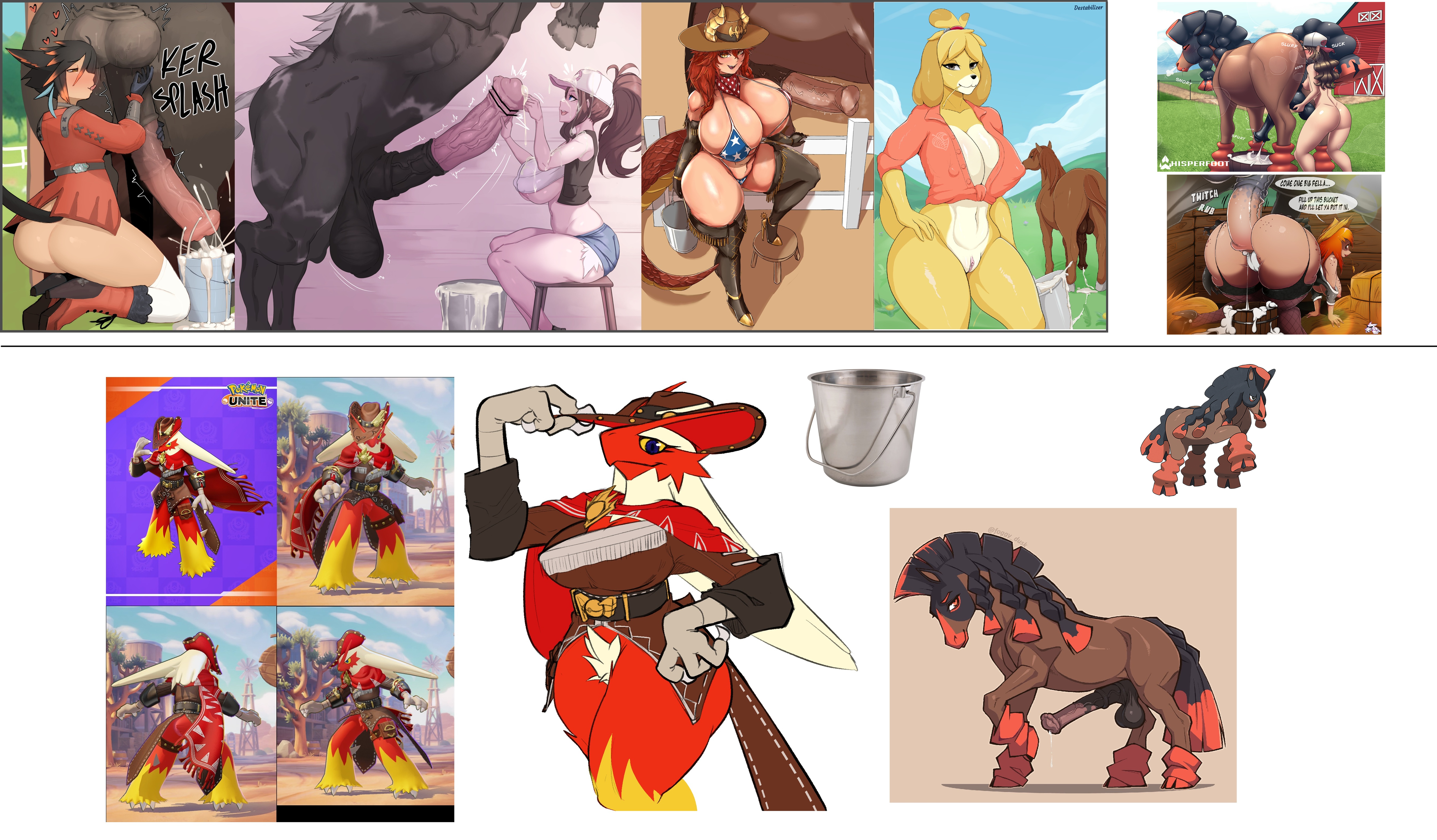 Requesting frontier-style Blaziken collecting semen via a bucket from a very pent-up Mudsdale.