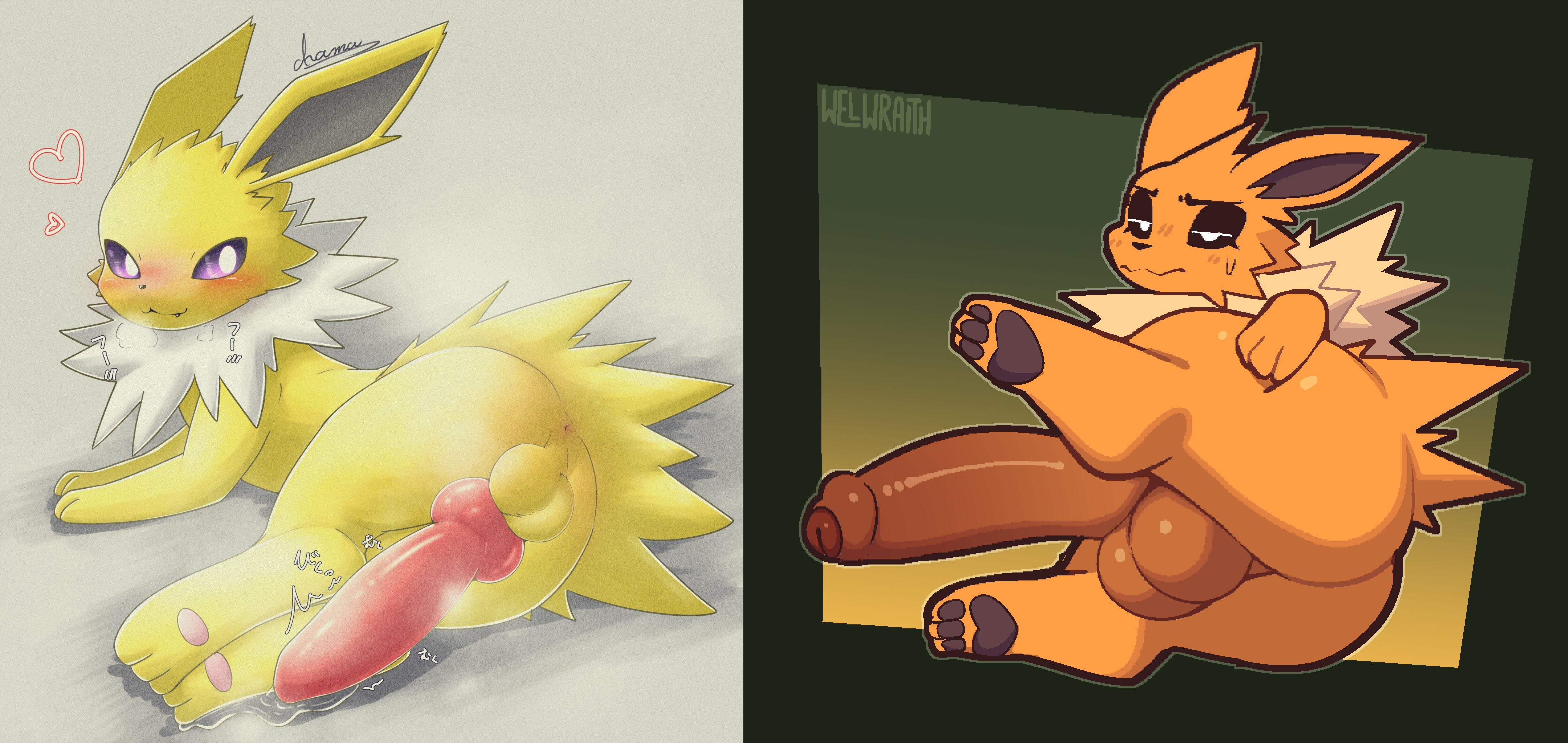 Requesting this Braixen (with heart pupils) getting mating pressed and vaginally creampied by this Jolteon.
