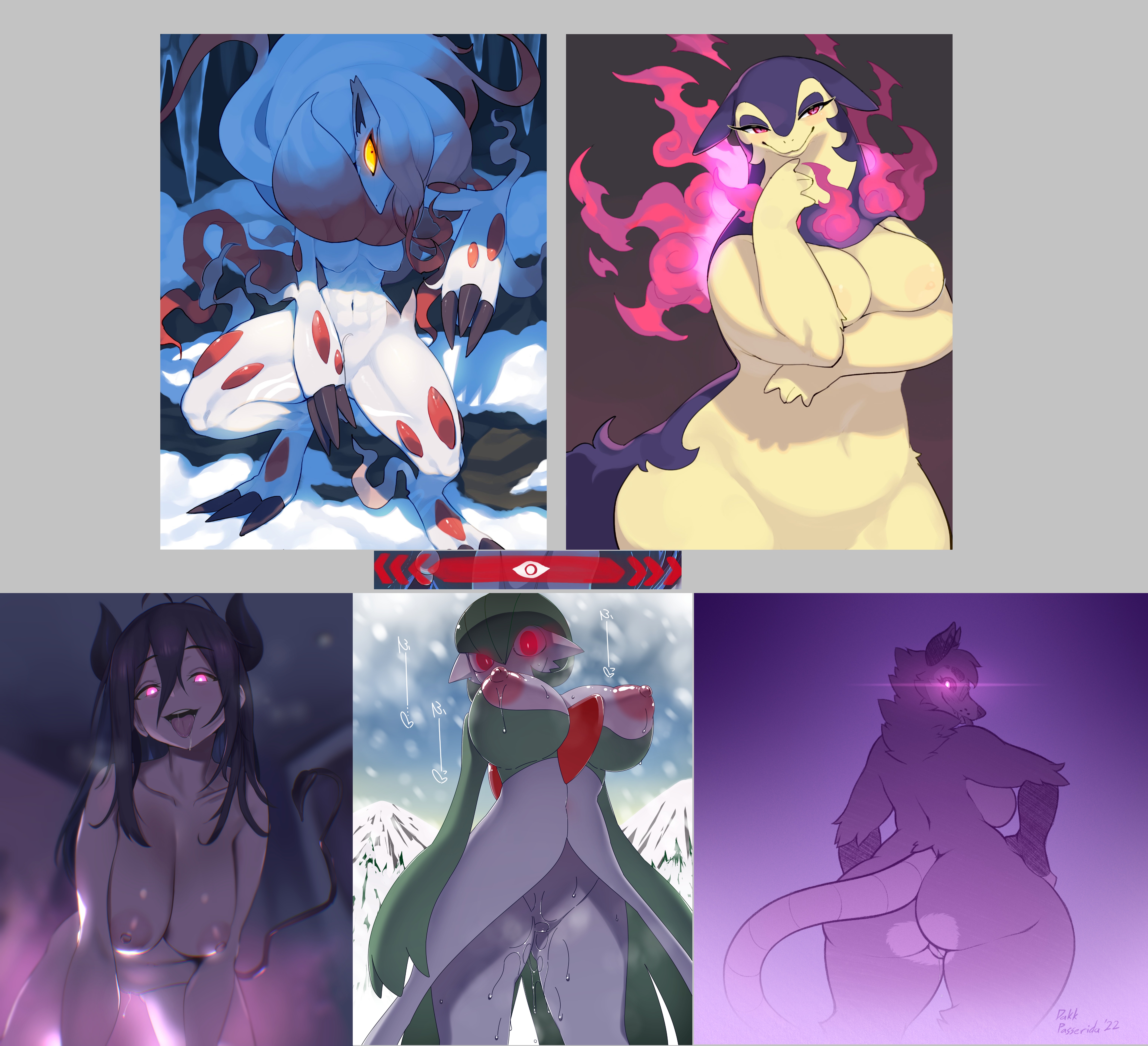 Requesting this Gardevoir being pulled or led around by the pair of Klefki pierced to her nipples