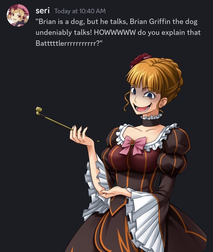 >>81912079You dare invoke Occam's Razor against the Golden Witch? Tsk.You see, Battler... Fiction is simply the word humans invented because they were TOO FRIGHTENED to call it what it truly is. A world. A REAL world!Brian Griffin suffers. AND YETTTTTT.He exists. He speaks. He LOVES!Tell me my sweet STUBBORN little Battler. When YOU cry at a story... What exactly are you crying FORRRRR? An illusion? Do humans weep for illusions?! Or do they weep because some part of them KNOWS That it is REAL!!!?Brian Griffin talks because he EXISTS in a world where dogs can talk! And THIS island EXISTS in a world where witches can kill. The logic is IDENTICAL, Battlerrrrr. You have already accepted one. You accepted it the moment you felt anything at all watching that pathetic dog live his pathetic life!