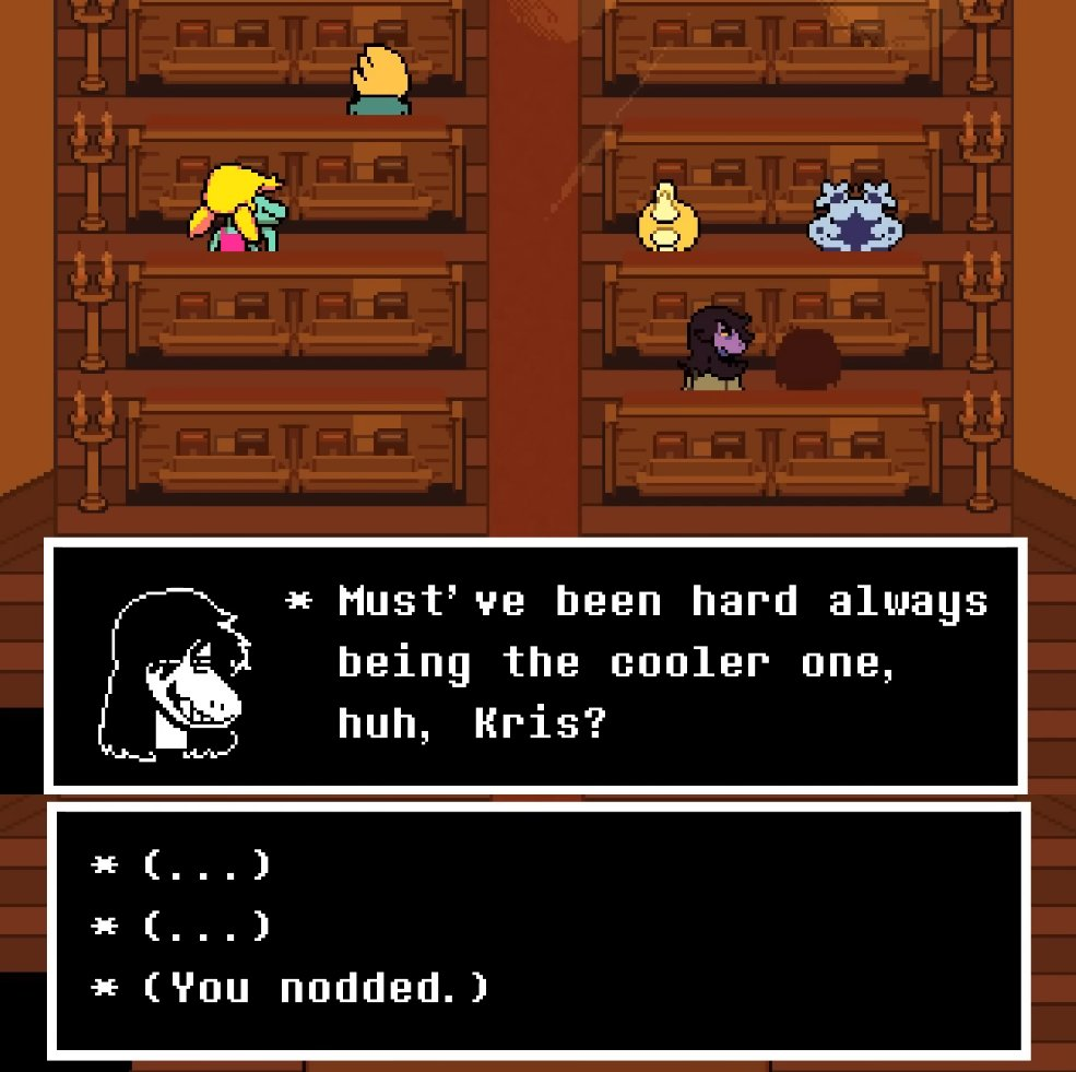 >>81913300Good. >>81913334Well its not to say the response is identical, it's just not... delicate? >>81922427It definitely would increase Kris self consciousness. All the blind praise would just make Kris focus on what's 'wrong' with them, crashing what's left of their self esteem. They'd also start to have some more constructed thoughts about the situation. Kris had a hand in this World, and the big bad of this place seems entirely focused on them and is visually similar to Susie and Noelle. Kris would start to wonder if this is secretly what they want. To do have TWO girlfriends who kiss and love on them, do everything for them, and say their perfect anyways while having no true opinions of their own. It makes Kris feel bad, and by the time the girls get to Kris to save them from Chilleen, Kris would be quite withdrawn from them. Of course, the girls love Kris and went through hell to get to them by that point so they're not just gonna let Kris sad sack it without talking about what's going on in their head. Veth on the other hand just wants to go home. Get the fuck up and close the Fountain, Kris.