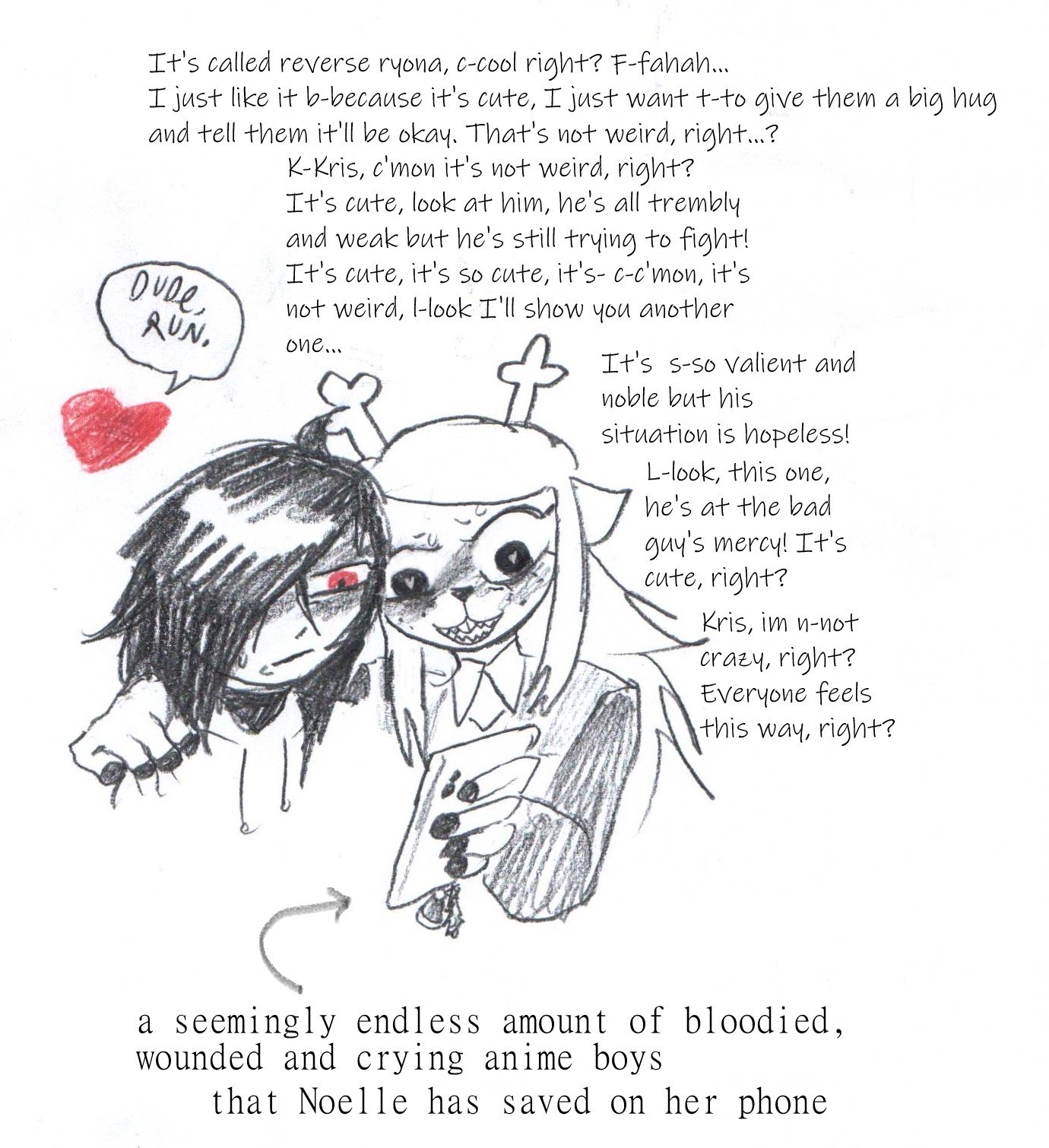 Ok, I think I might have something else for doefinitive. For the scene when the girls bring Kris's Soul hidden in the angel doll back from the basement>(After the bit where Susie the joke about a "severed hand" following them)>(Skip the bit where Noelle asks to raise the "severed" hand as a pet with Susie, go straight to Susie and Noelle laughing after the "I'll raise it as MY pet")>Instead Susie continues the conversation rather that Nole>"Ya know... it's funny.">"I've never actually...hung out with other girls before.">"Huh? Aww, Susie.">"Yeah, the girls where I''m from...">"Would scatter the moment they saw my teeth.">"So I thought, 'why waste my time'?">"And the boys, well...">"Until I met Kris, I was just some great big purple freak.">"!!!">"What's wrong, Susie?">"The moment I said his name, it...">"The angel doll, it just got REALLY warm!">"Really? Wait, let me try.">"...">"'Was it a dream, Kris?'">(Noele blushes and backs away)>"Umm, welll, I think I need to, um">"Cool off for a bit! Fahahahaha!">(Noelle leaves the room)>"Dream?">"!?">"Wait, Noelle! I need to hear everything about your dream! Right now!">(Susie follows, you know the drill)