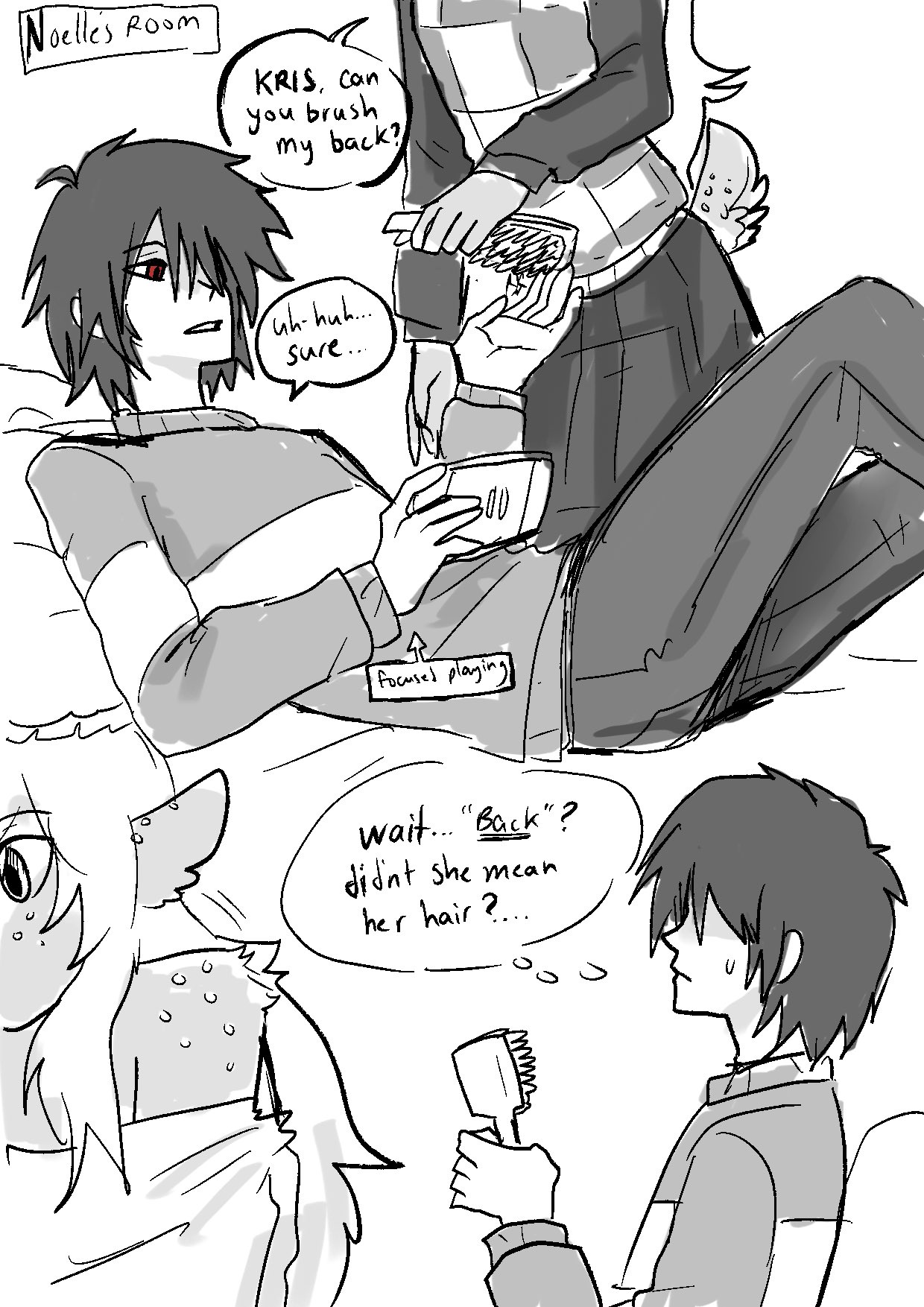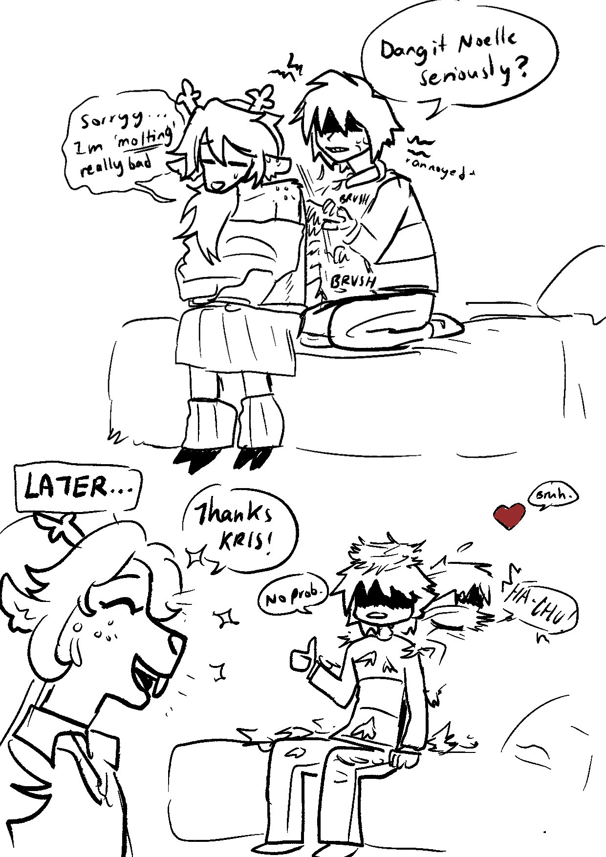 >>81920834It's gonna be very tough if the jealousy angle comes around to who you decide to spend more time with. That emotion is one thing we may have already started to see in Susie based on some of her behavior in Dess' room, and Noelle is pretty much steaming with it toward Kris any time she learns the two of them are doing anything remotely friendly together. You can even torment Noelle with this by ditching her in her yard and having the QC cutscene, then returning. Toby knows.Kris making Susie jealous with Noelle because she's never had what they have...Kris making Noelle jealous with Susie because she can't have what they're having...Ahh, young love. It will hurt immensely for someone.