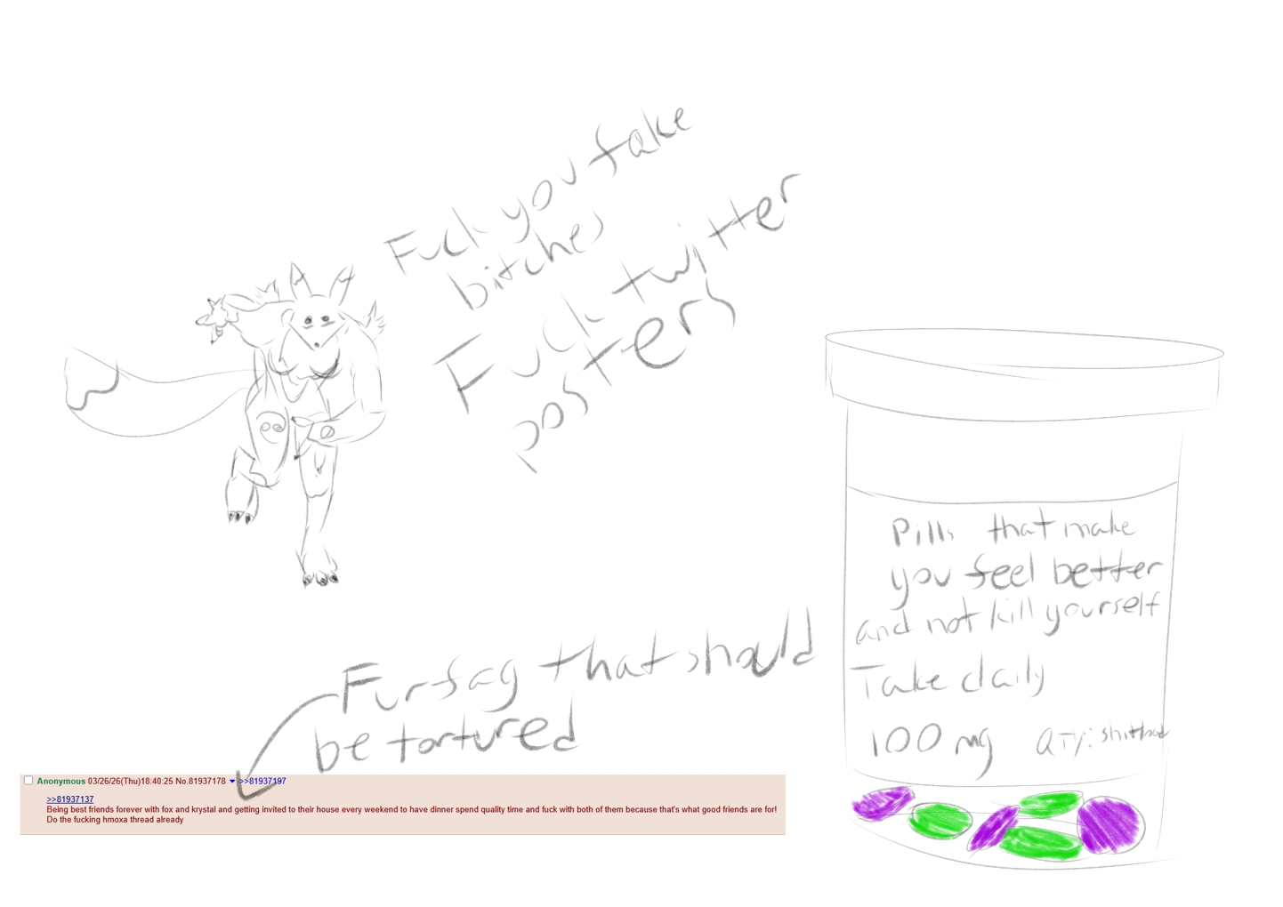 Don't worry about it. I'm in the same boat, but it gets better with practice. I'm very self-conscious about my work and would often worry about the quality of it, which wastes a lot of time. Someday I will have crazy output, but I have to make do with the skills I have.I am planning to release two or three request pieces tomorrow (more if I get motivated).>>81939199Very nice drawing of Krystal, Demi. I wouldn't mind seeing Anastasia getting drawn eventually! I might have a small proposal with a certain purple lizard girl if you are interested.