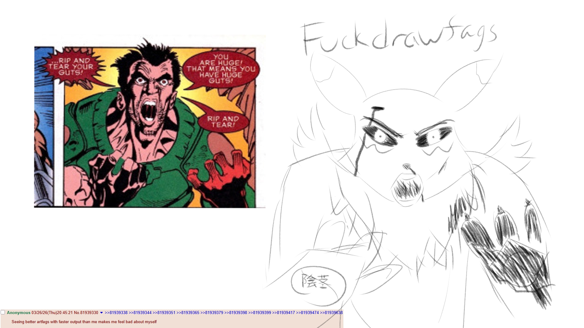 It's kind of nice that he way overplayed his hand on the discord/drawfag matter. It makes it way more obvious he's just a shitposter with how he can't stop saying the same meaningless stuff over and over. At least we still get art and stories will he spergs out.