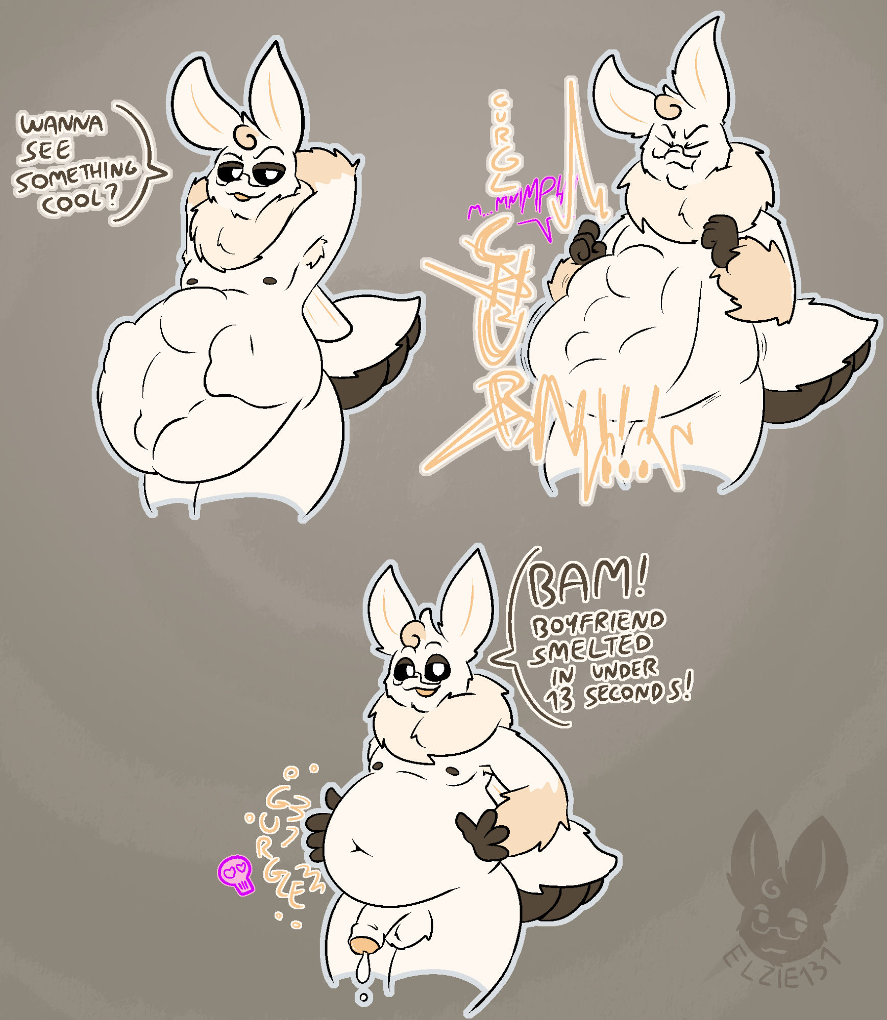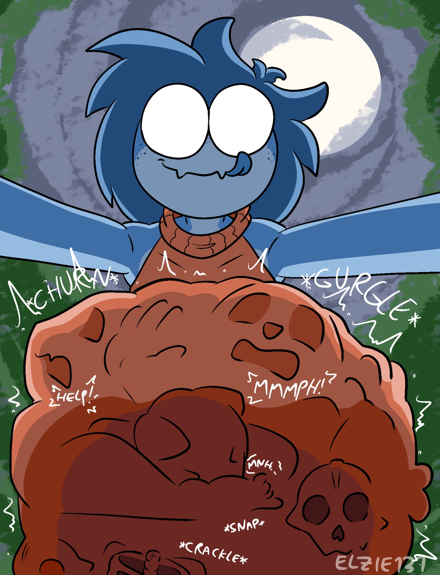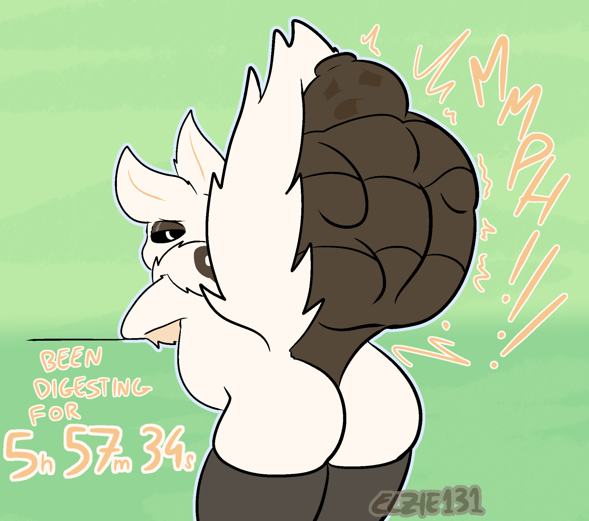 >>82039490Didn't add my sig to any of the pics, but this is Evergreenplate.>>82039738Thanks!Bubbles around her mouth showing off the belch in the water. Some discoloured saliva/stomach juices around the bones dissappating into the pool water.You can also have some belly blush to show her gut being strained from it's new size.Additionally some stomach noise onomatopoeia can't go bad.