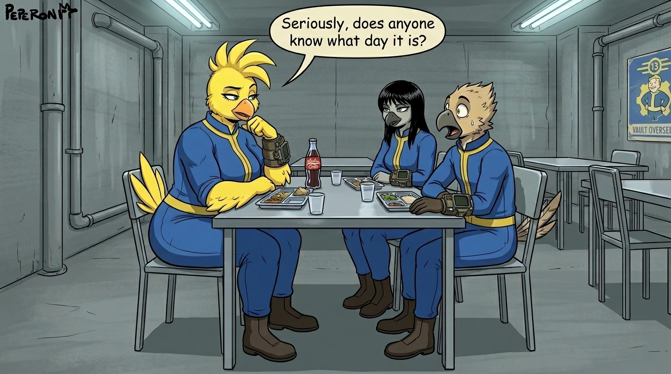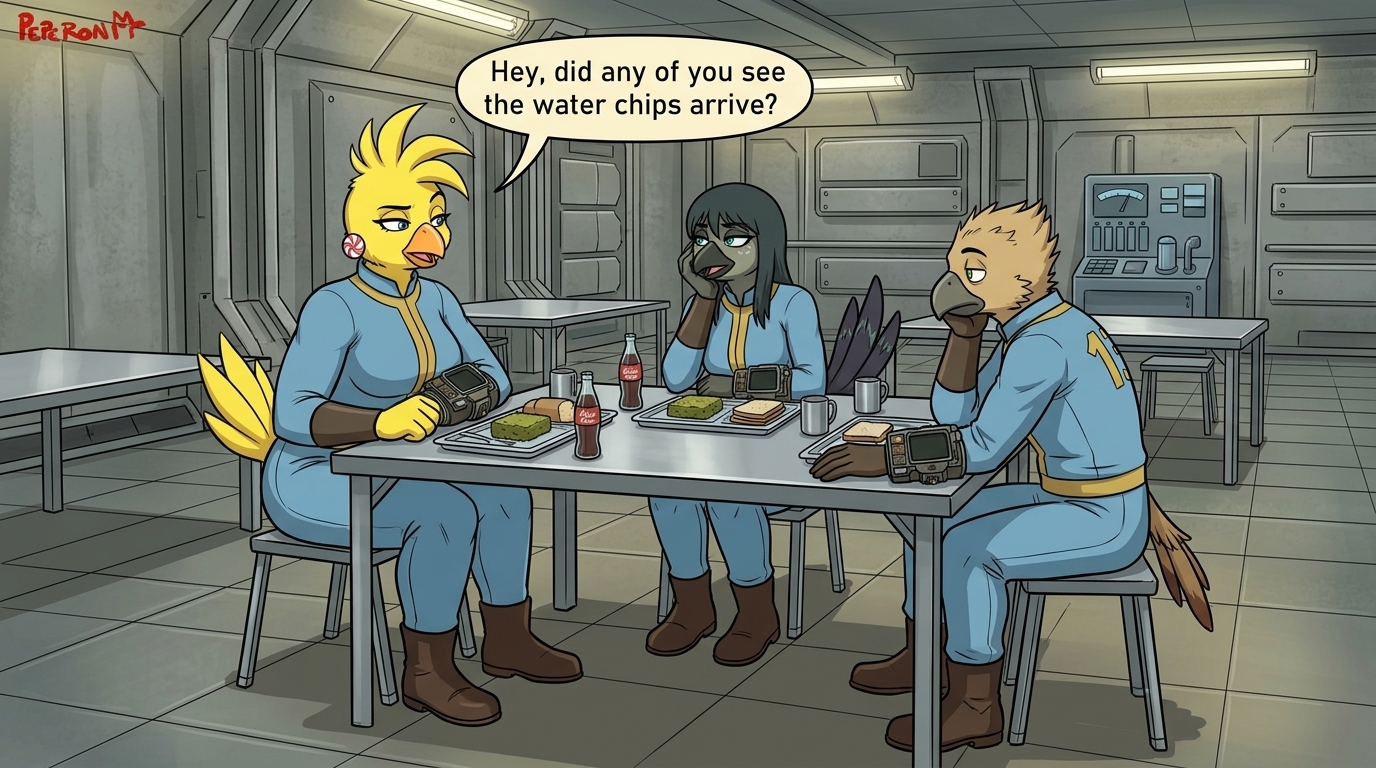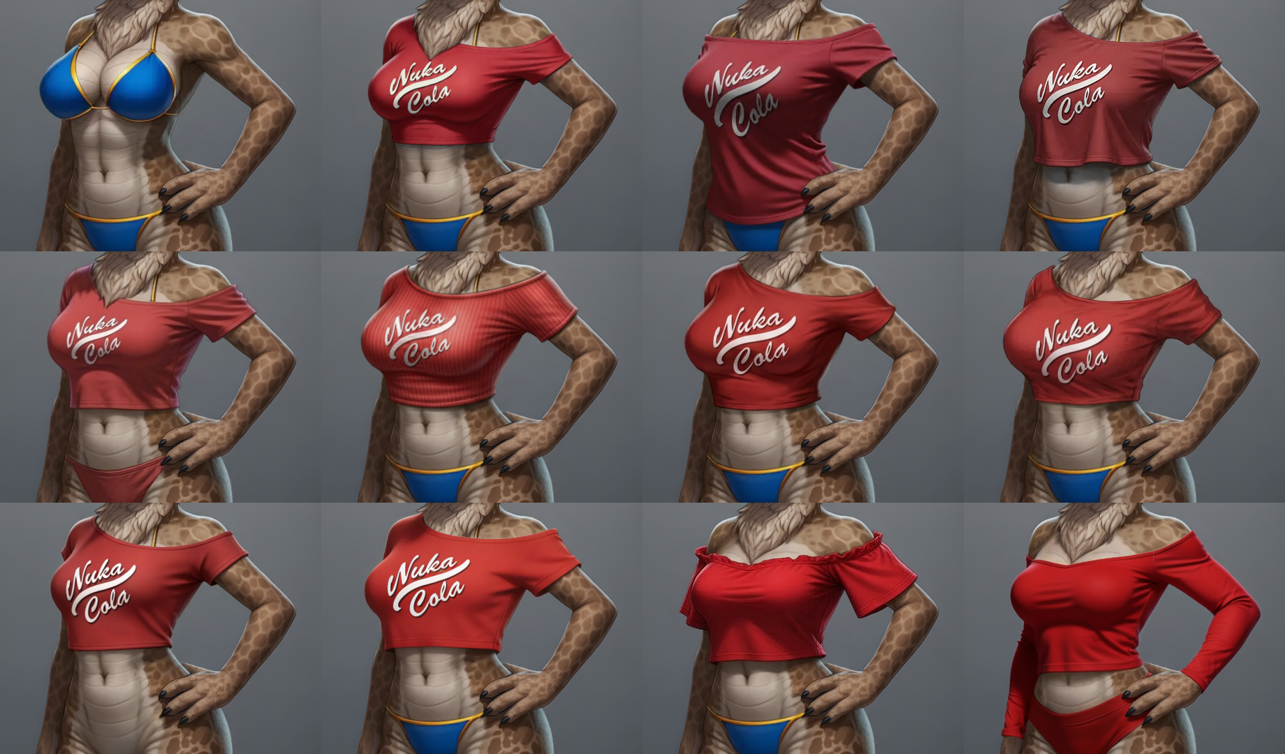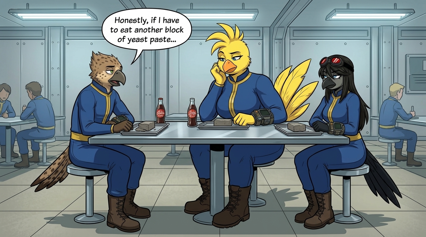 Before creating the classroom pic, I did a wardrobe test and pitted several AI models against one another to see which could do a proper job of generating an off-shoulder Nuka Cola crop top. Results were mixed.Almost every AI wanted to reduce Walks' bust size, despite my instructions to not change her proportions or body. There was a bias toward form-fitting tops; FLUX.2 Klein was one of the few to generate a looser, more draped fit. And though the reference image indicated one shoulder should be bare, I often got both shoulders instead. On a couple of occasions, the AI ignored the reference image entirely and just did its own thing, based on the description alone. Seedance, on a couple of gens, interpreted the prompt to mean "dress her EXCLUSIVELY in the reference top", and removed the bikini bottom; I'm not sure how those slipped past the filter. A few gens changed the bikini bottom to colour-coordinate with the top.Wan 2.7 Image just became available, so I gave it a try as well. The results were pretty much the same as the others, but it gave me four 2K image-edits for just 2 credits, which seems like a fairly good deal. I could have generated them for free by turning off the credit system, but I didn't want to wait.