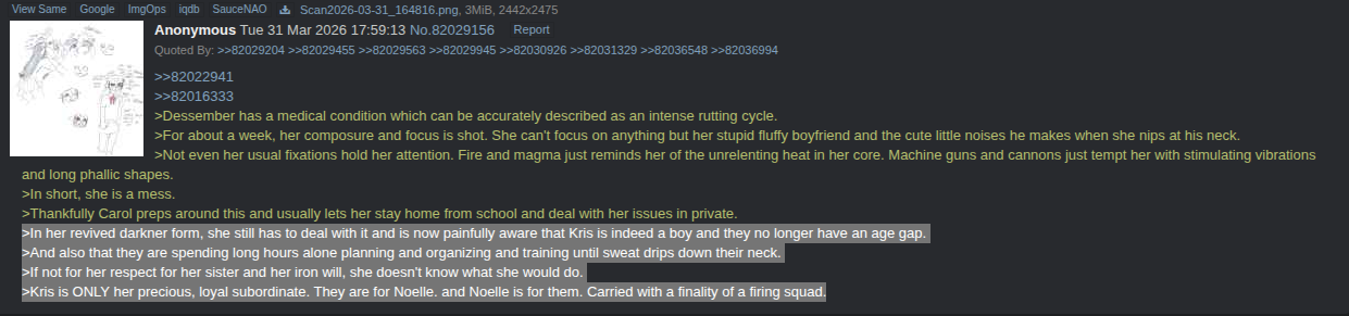 >>82052329...I don't like Dess, btw. Honestly Whump in general is just a weird guy to me, even if I can appreciate how often he contributes.>>82052440Dess is absolutely a /doe/ topic due to her impact in the overall plot, and how relevant she is to Noelle in particular, but a lot of people forget this is ultimately a Noelle thread first.