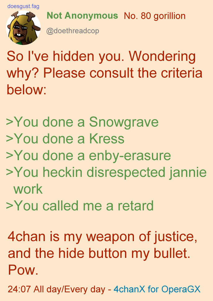 >As a Kres-Post hidden. You wasted all that time and effort to get ignored in two seconds. It's the least your kind deserve for damaging this general's identity. I hope you feel ashamed for wasting your time and learn to grow as a person.