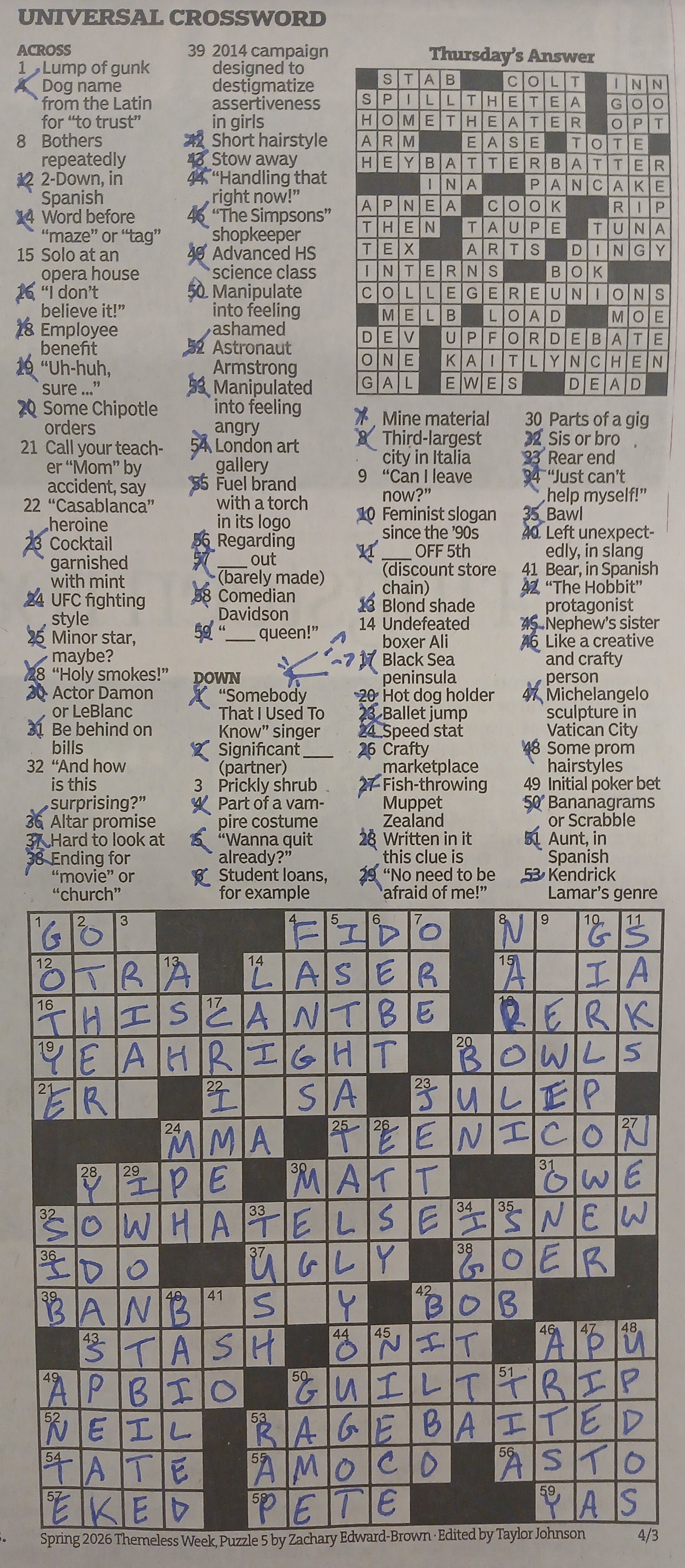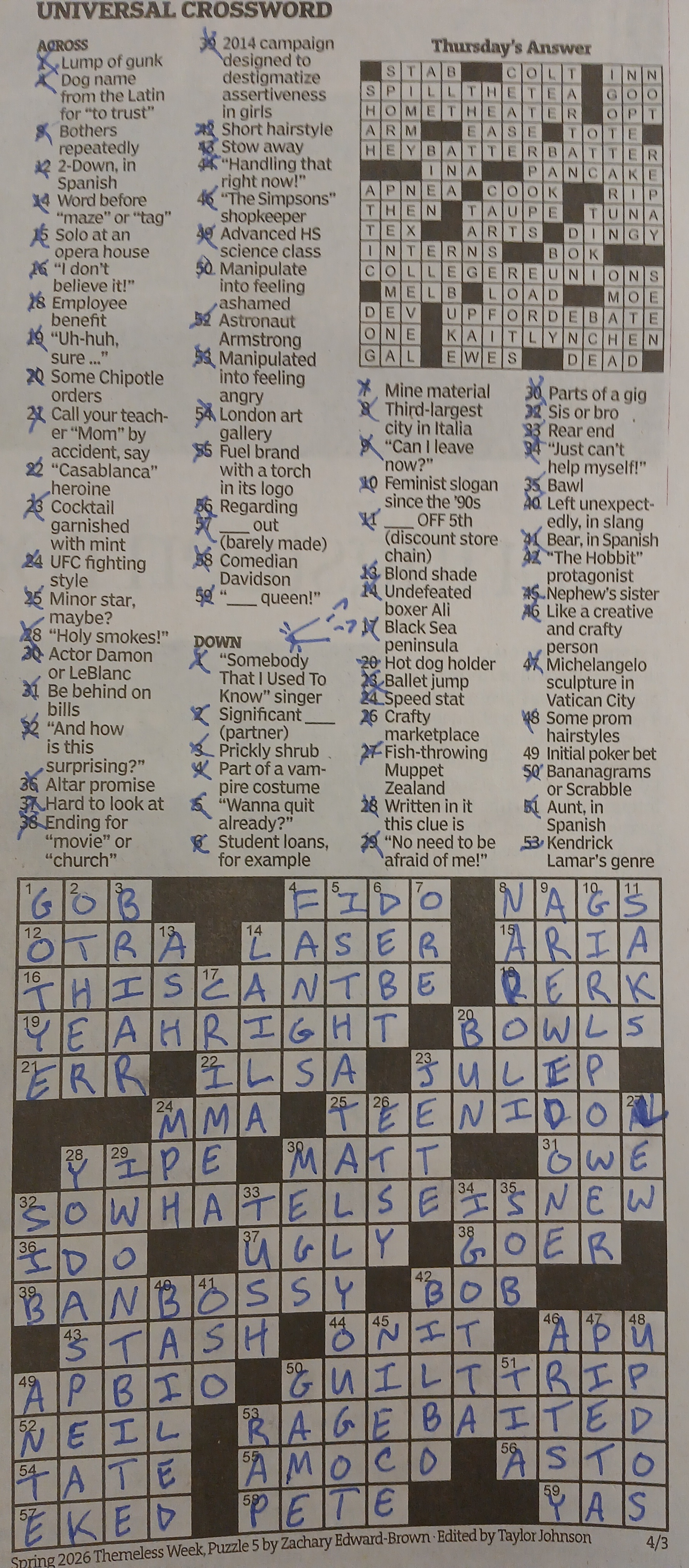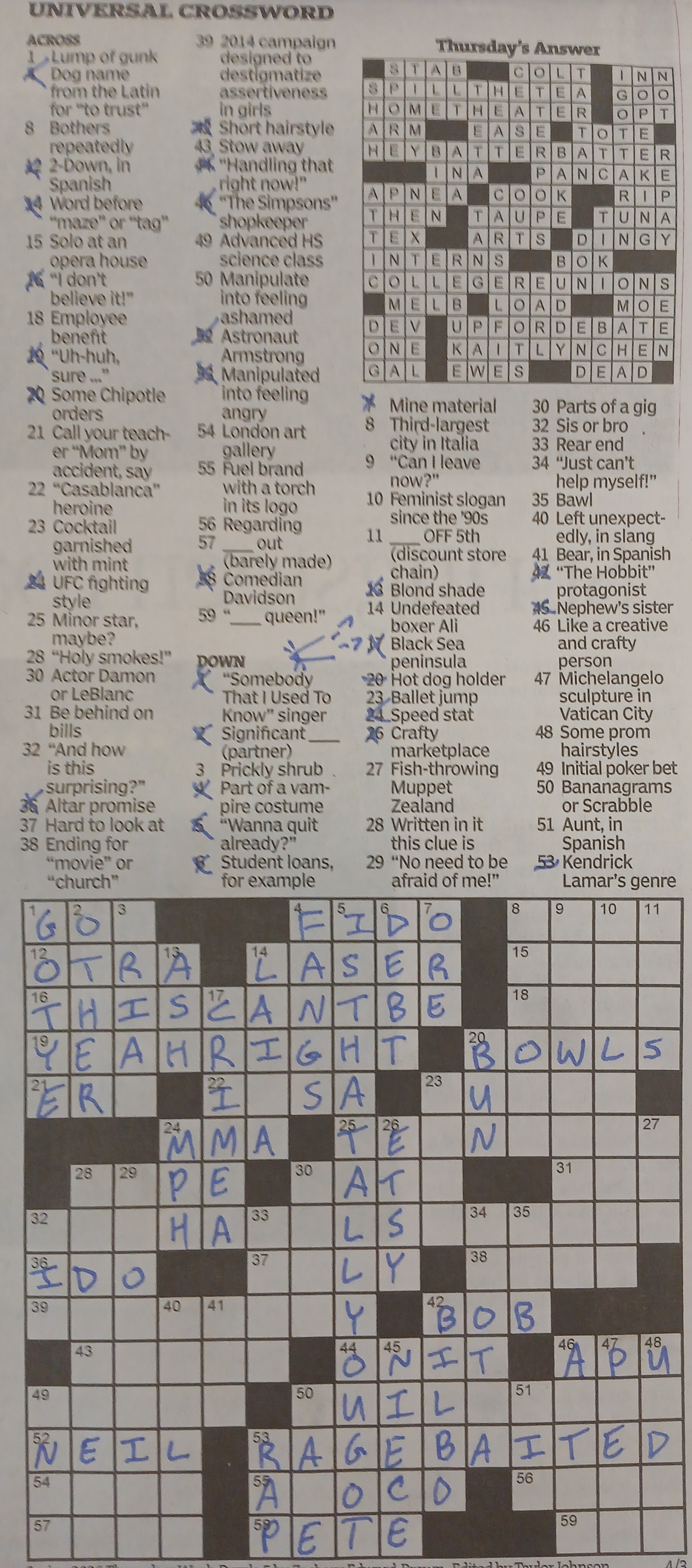 >>82082106reposting it here just in caseacross:12. otro14. laser (?31. due36. vow37. ugly46. Apu52. Neil53. please tell me the answer isnt ragebaited57. luck59. yas (?down:1. Gotye4. fangs6. debt24. dex (?35. cry41. oso45. niece52. tia