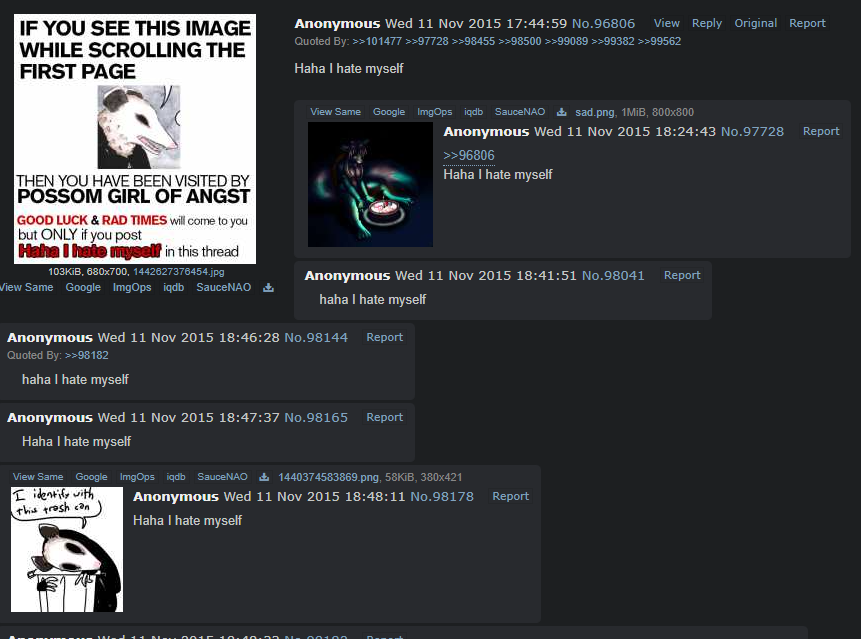 >>82094029i remember posting the first few threads here once or twice when i was surfing the archivesthey werent really haha threads but rather just "you were visited by the possum girl of angst good luck will come but but only if you reply with 'haha i hate myself'"