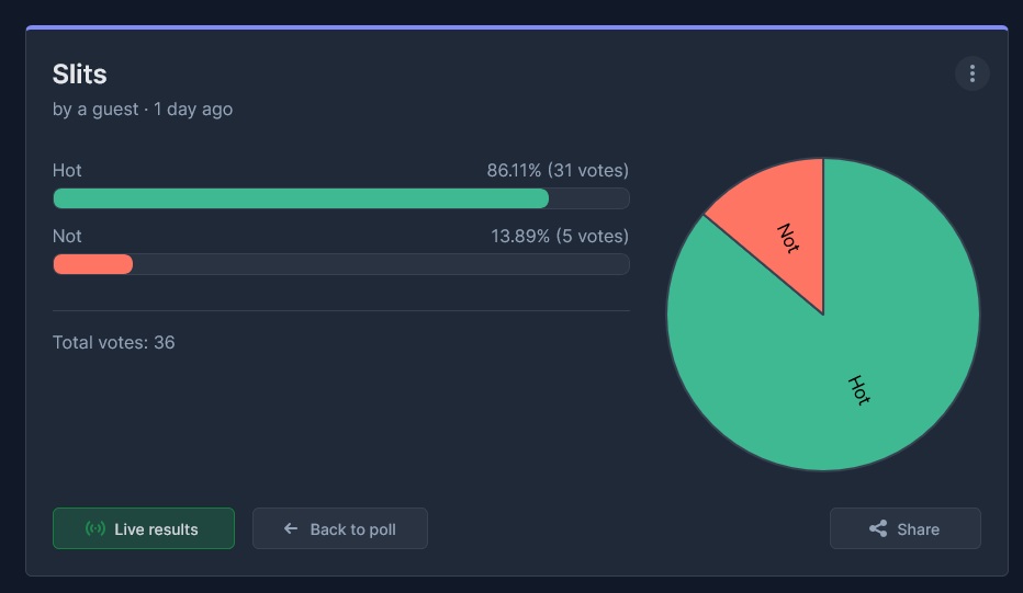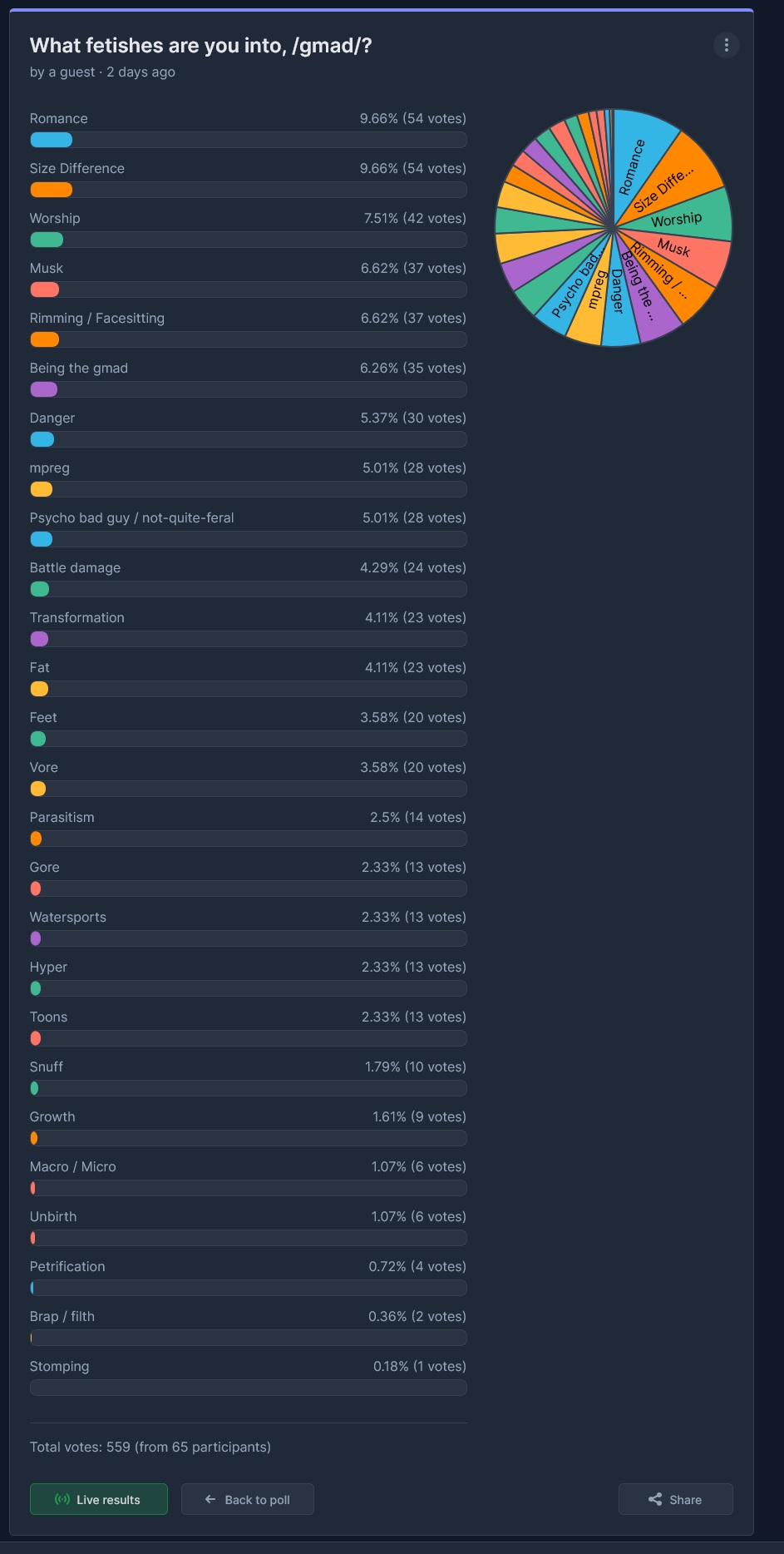 >>82114473There's likely a few more than 65 because the poll is voluntary (always a bias there), but it seems like a good dataset just examining the lack of extreme fetishes near the top.>>82115545To speak for the lurkers, few reasons: time, and anxiety. Time because not everyone wants to spend it making a comment on how they feel, or practice writing like I do, and anxiety because not everyone wants to have attention given to them, even in implicit anonymity on the internet.I figure the ratio of lurkers is very dependant on how accessible the media is. You can see general lurk rates are as high as 99.9% on YouTube, Twitter, Instagram, and they drop off slightly with the size and scope of accessibility. Although, some more private Discord servers I'm in have a lurk rate as low as 60%. Here, I'd say the lurk rate could be about 80%.