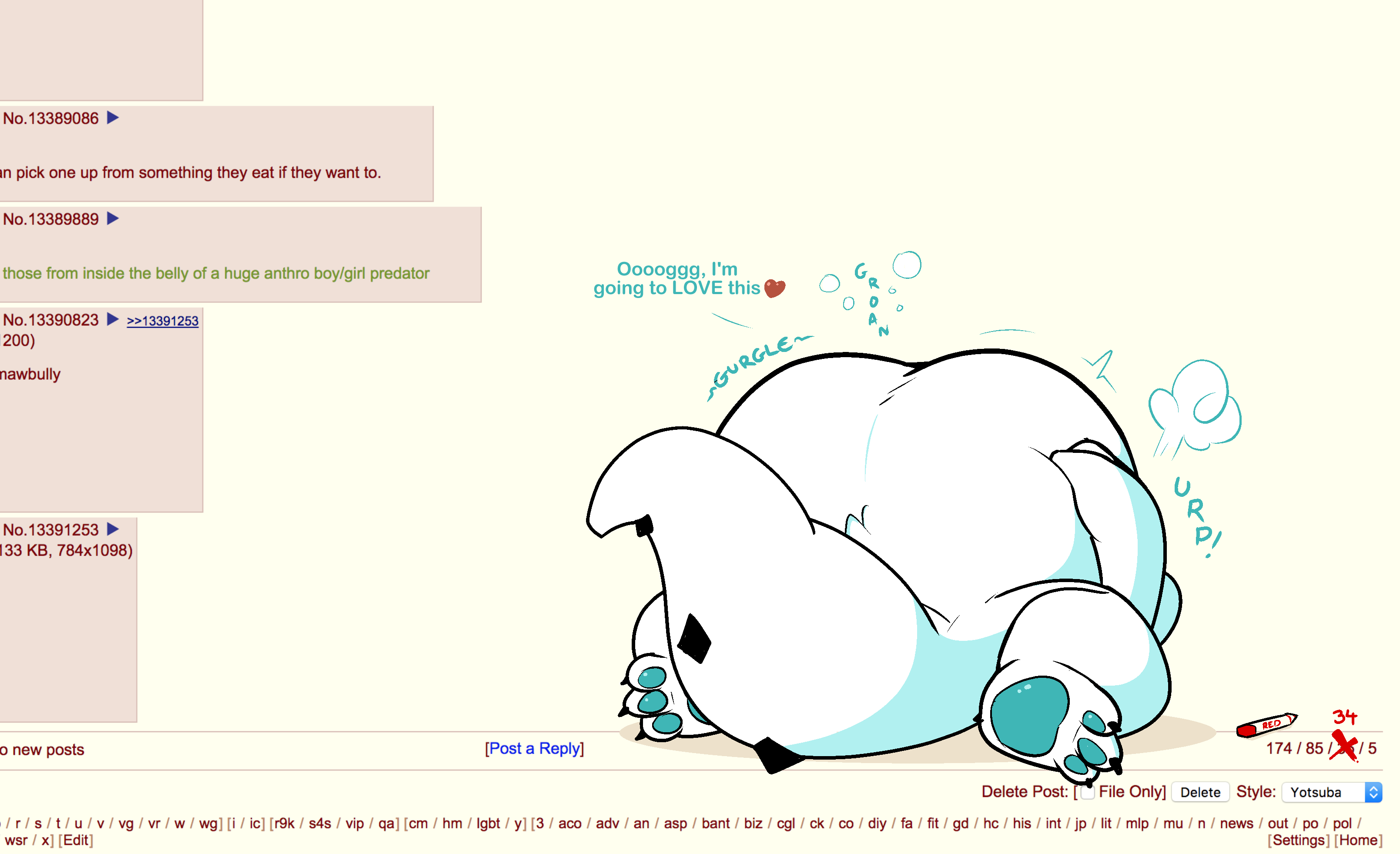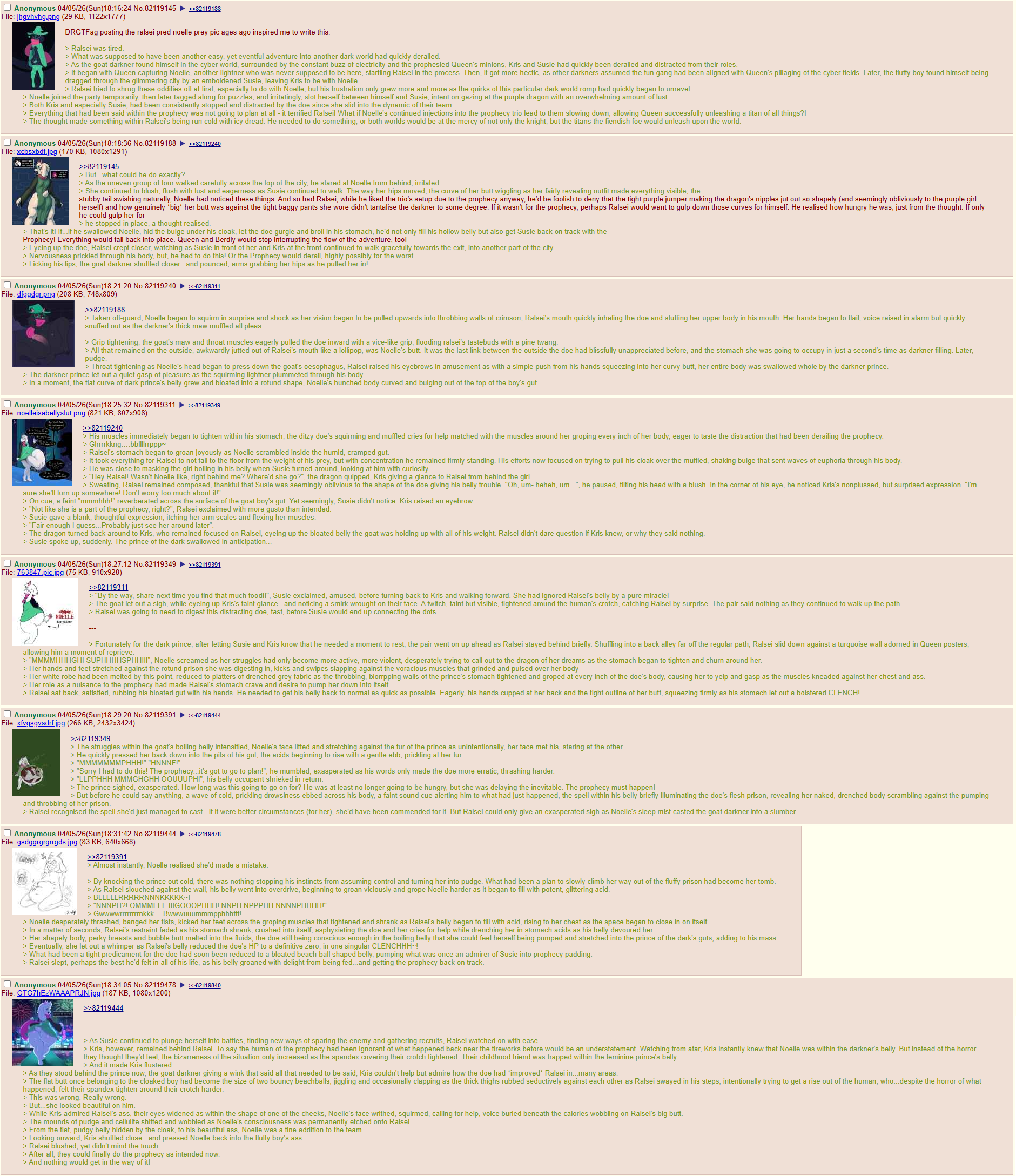 Welcome to, /vore/ the vore general!Your apparently deeply needed reminder to not reply to obvious bait (Obvious rage baiting, politics that have nothing to do with the thread topic, ect. No Patrick, just because you added a belly doesn't make it not spergy) and post what you like and ignore what you don't. It's that easy. Other anons will thank you for it silently.Missed some threads?: https://desuarchive.org/trash/search/subject/%2Fvore%2F%20general/Pastebin: https://rentry.org/vorechangtsQoTT: Thoughts on when a pred is so obviously full of a prey, during or after digestion, but no one seems to suspect them of predding?