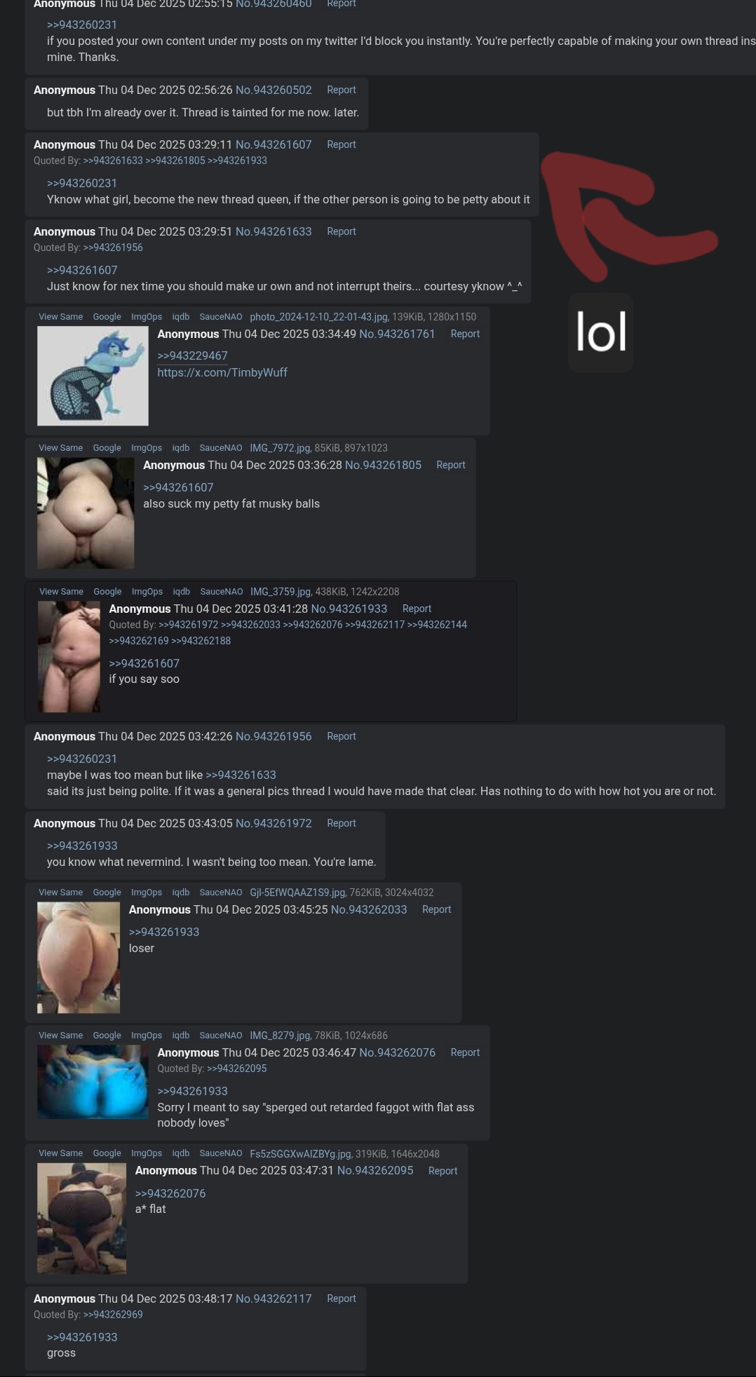 Here's Timby having a melty because someone else posted their body in a thread they made! Look at the quoteshttps://archived.moe/b/thread/943229467/#943261933