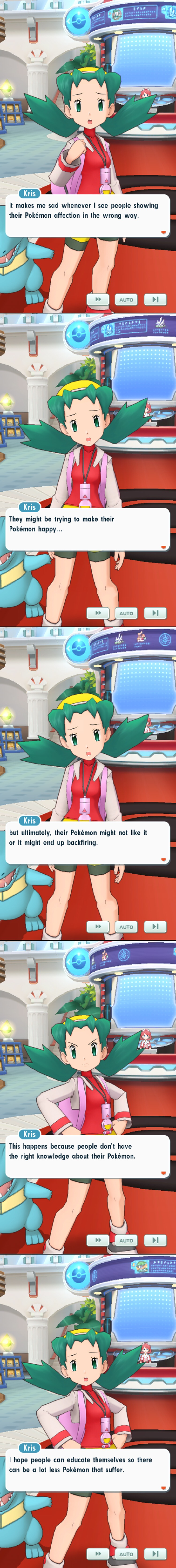 >>82254696Clearly she's on our side, guys - the only way you could "show your Pokemon affection in the wrong way" is to completely ignore their needs and treat them like animals instead of equals. Thus, she's urging you to fuck your Pokemon, marry your Pokemon, and pamper them - it's the only right way to raise them, and it saddens Kris to see people feeding their Pokemon from dog bowls an the such. Given how happy her Totodile is, it's clear she must take his dick after every battle.