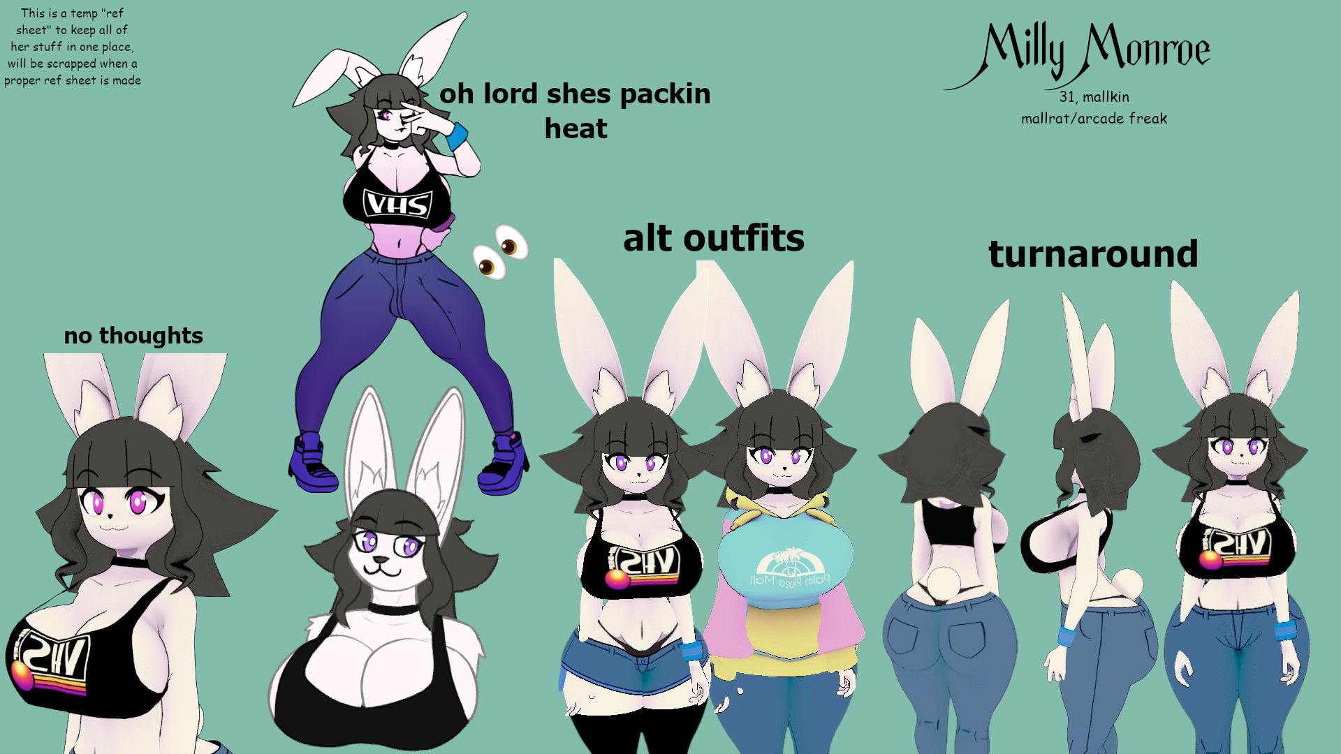 Was suggested to share my oc milly here, so I whipped her up a temporary ref sheet to get all of her in one place. I hope yall like her and I'll gladly answer any questions yall wanna ask about her!