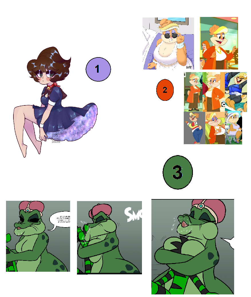 >>82135237Requesting that this brunette OC (original character) number 1 gets aggressively kiss-tackled by the two ladies from the bottom picture: number 2, Patricia Bunny from The Looney Tunes Show, and number 3, the green frog GILF.Similar to the reference picture provided in these links:https://postimg.cc/NKxHvn90https://postimg.cc/Fdwfx5qThttps://postimg.cc/1fhnnSDt