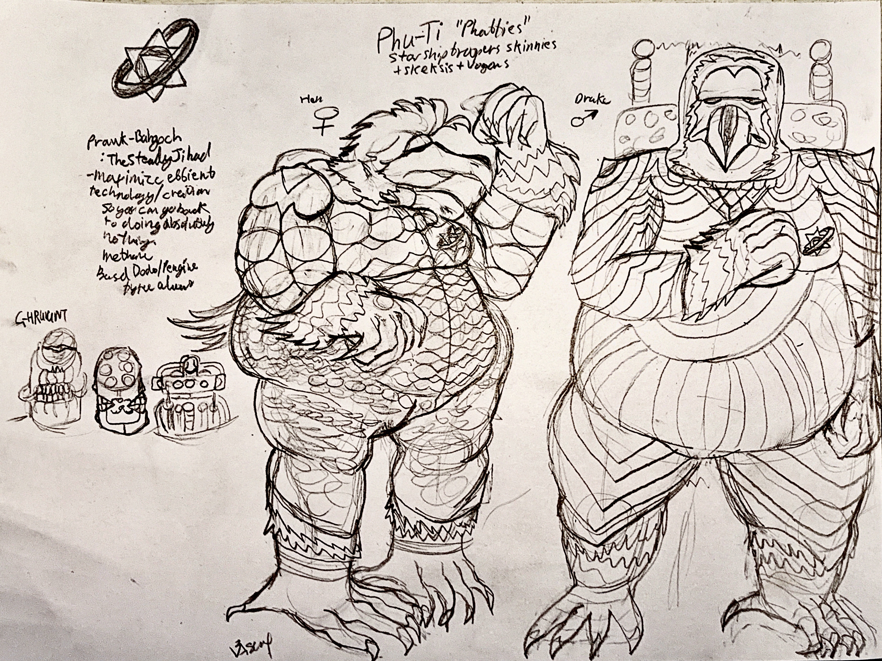 >>82135237Requesting more Phu-Ti/Phattie art.I'm creating an Apathetic Avian bird race called the Phu-Ti/Phatties,based on a parody of the Skinnies from starship troopers and mixed with the Skeksis and Vogons,can you help me design them? the Phatties/Phu-Ti believe in "Prawk-buhgoc" itself meaning "the Slow March" or "The Steady Jihad",which seeks to bring stillness and rest into the universe. However they are so obsessed with it they spend more time working than resting because of it. First drafts.